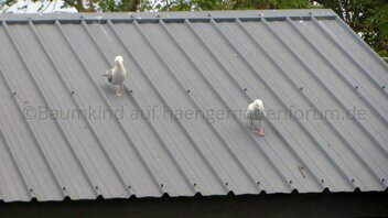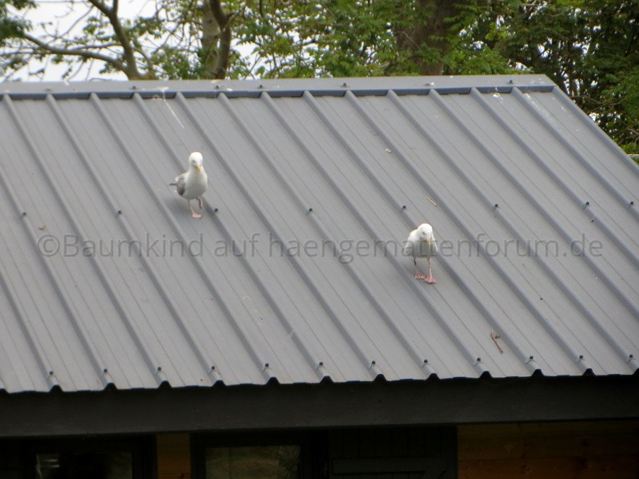 Ach ja, und dann war da noch die "Müllwe", die gleich am ersten Tag unsere Mülltüte zerfetzt hat. Er wartete jeden Tag, geduldig, und sobald jemand seine Parzelle verließ, war er sofort da (ihm fehlte eine Schwanzfeder, woran man ihn zweifelsfrei wiedererkennen konnte). Irgendwann hatte er gemerkt, dass man auf den Blechdächern der "Mobile Homes" des Camping-Platzes prima runterrutschen konnte.