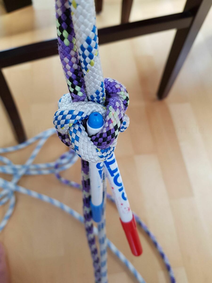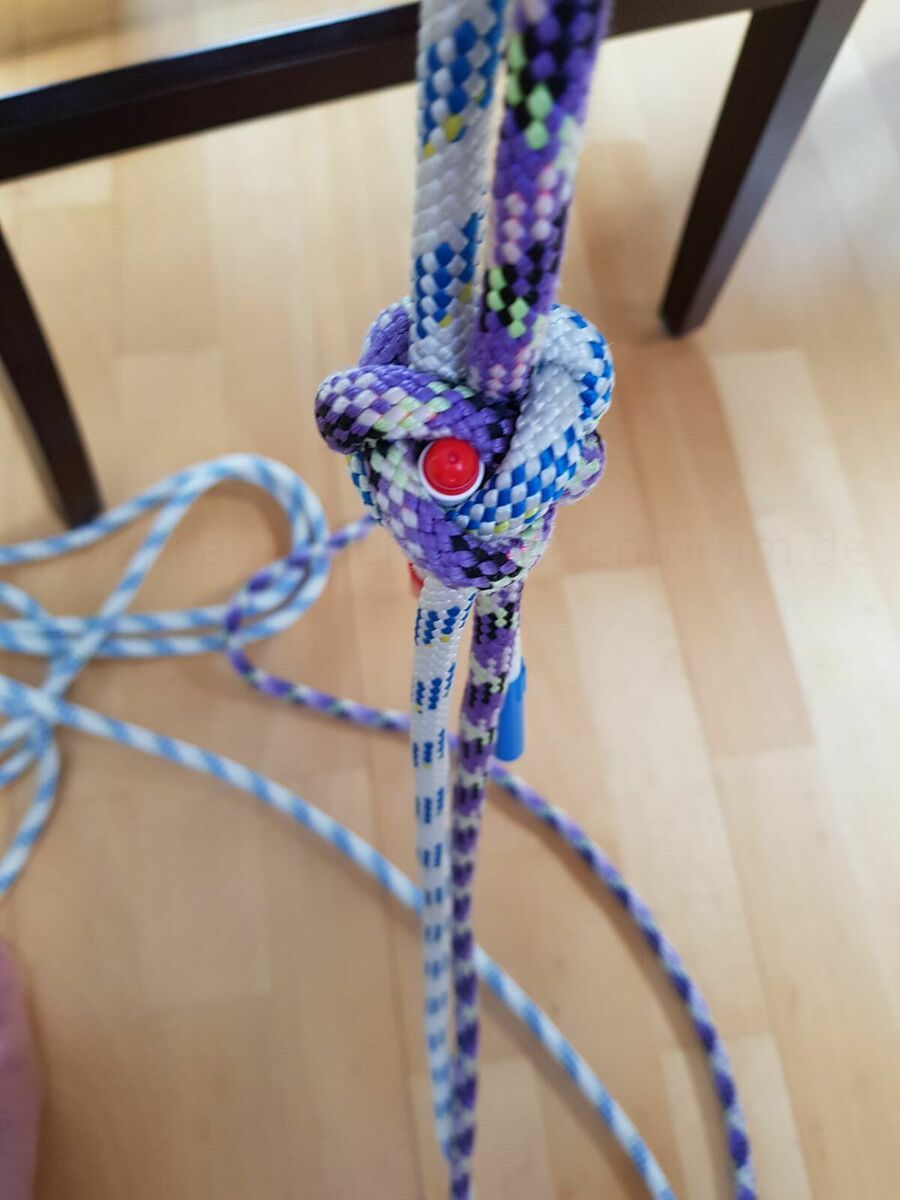 2 Leinen kommen in den Knoten rein und 2 Leinen kommen auf der anderen Seite wieder raus.