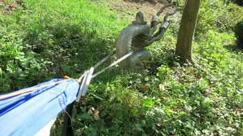 Um beim zulässigen Hängemattengewicht ausreichen Reserve zu haben, folgt anschließend ein doppelt gelegtes Stahlseil (8 mm), gehalten von einer Umlenkrolle.