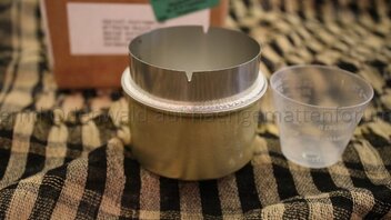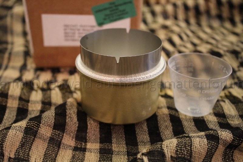 - Pastetendose (DM) mit üblicher 330 ml Dose (z.B. Coke): die normalen 330 ml Aludosen sind so dünnwandig, dass das Alu die Hitze des brennenden Spiritus nicht aushält. Es verliert an Stabilität und kann das Gewicht des Topfes nicht halten.