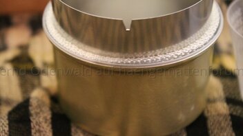 • Aus gegebenen Anlass gebe ich hier mal meinen Senf dazu, denn ganz nach Vorbild von B. aus O. war ich auch der Meinung das ich so ein UL Kocher brauche. Irgend wo muss ich ja mal anfangen mit dem UL und so. Ich also die Bestellung aufgegeben, natürlich die Version: nur vom feinsten, also mit Simmering, klar, man hat ja sonst kaum was vom Leben. Die Lieferzeit hat für den modifizierten Katzenfutterdosendeckel ca. drei Wochen benötigt. Ich habe ihn gleich mal zu Hause auf dem Herd mit der Induktionsglasplatte ausprobiert und erst mal bemerkt das die Ansage, das Teil wäre super leicht, absolut zu trifft. Dürfte also bei verpacken mit Vorsicht zu behandeln sein, das der Kocher dann auch noch beim auspacken noch einsatzfähig ist, denn durch das geringe Eigengewicht ist das Material aus dem er gefertigt ist halt auch dementsprechend dünn. Vielleicht ist es aber auch anders rum. Ich also Sprit rin, Feuer dran und schön gleichmäßige Flamme rundrum. Der nächste Schritt war dann: Wasser in den Topf und auf den Stove. Also ein Wassertopf mit einem Durchmesser von ca. 100 mm auf ein Brenner mit einem Durchmesser von ca. 40 mm. Puh, ich habe mich nicht getraut den Blick ab zu wenden, nicht das mich die schöne Flamme immer noch Hypnotisierte, sondern ich hatte Angst das Ding kippt mir um und dann kommt dann gleich der weiterführende Gedanke: was mach ich im Wald, wo ich sowieso kein Feuer machen soll und dann auch noch mit so einem wackligen Teil. Ich also ins Internet, natürlich erst als ich den Brenner abgestellt hatte, um nach einen Ständer zu suchen, war auch fündig, passt aber nicht so richtig, denn der Topf, habe ich mittlerweile gelernt, soll mit der Oberkannte des Kochers aufliegen. also werde ich mir Federn besorgen müssen, um an einen umkippsicheren Ständer den Fancy so zu befestigen, das ich mir sicher bin das der nicht umkippt und trotzdem alles passt. So schnell bestelle ich nicht noch mal was am anderen Ende der Welt, wo die Postgebühren fast teurer sind als die Sendung selbst. Die erweiterte Variante zu bestellen stellt sich übrigens auch als Luftnummer heraus, doch siehe selbst.