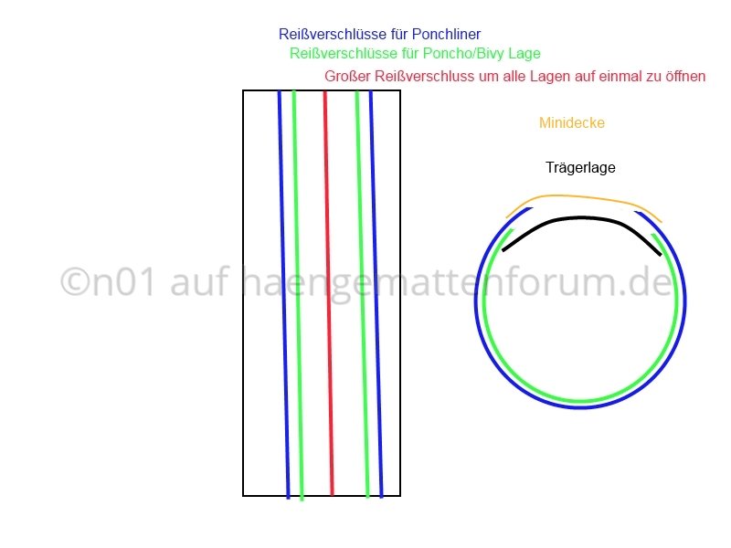 Also wieder zurück auf den Weg und weiter überlegt was könnte ich tun. Da kam mir der Gedanke eine Art Mittelteil zum verknüpfen mehrerer Schichten zu bauen. Zuerst dachte ich mir eigentlich eine coole Idee. Ein Zwiebelsystem soll ja eh mit das Effektivste sein, wenn man mal das Gewicht außen vor lässt. Aber durch das einsparen eines UQ und Quilts bzw. Decken etc. sollte das Gewicht trotzdem noch geringer sein als zuvor. Das Mittelteil würde die fehlende Stoffbreite auffüllen die ich benötige und außerdem ermöglicht es mir mit einem Großen Reißverschluss alle Schichten auf einmal zu öffnen. Jetzt gefiel mir die Idee noch besser als zuvor denn mal ehrlich wenn man Nachts raus muss will man nicht erst X Schichten öffnen. Da erinnerte ich mich an ein DIY Projekt auf der "Just Jeff's Hiking Page, eine Art Kapuze für den Peapod(http://www.tothewoods.net/HomemadeGearPeaPodHood.html). Cool das könnte man gleich mit an das Mittelteil anbringen. Wenn man oben was dranhängen kann dann sicher auch unten. Es wurde immer fantastischer(zumindest in meinem Kopf^^), ich sollte wirklich öfter Spazieren gehen wenn ich beim lernen oder auf der Arbeit nicht weiterkomme. Also kann man ja auch eine Hängemattensocke mit dran bauen. Am besten abnehmbar, dann kann die Socke gleich als Packsack dienen. Als ich oben ankam war mir klar ich muss gleich wieder zurück nach Hause die erste Konstruktion Planen. Und nein es lag nicht an dem Schneesturm der auf dem Berg allein das Atmen zur Qual gemacht hat.