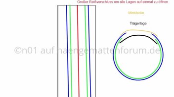 Leider wurde mir schnell klar das die Idee Top ist, die Umsetzung allerdings so einige Tücken mit sich bringt. Das Mittelteil müsste Isoliert sein sonst wäre die ganze Sache sinnlos. Ich möchte das ganze wie folgt realisieren: Ein 1,50m x 0,7m Quadrat das in der Mitte einen Großen Reißverschluss hat und dann rechts und links davon mehrere Reißverschlüssleisten eingenäht sind. Die erste im Abstand von jeweils 15cm zum Großen Reißverschluss dann jeweils alle 5cm eine weitere Leiste. Zuerst war der Plan eine Art Minidecke zu nähen aber egal ob ich nun die Reißverschlüsse an der Unter- oder Oberseite anbringe das Gewicht der Lagen würde die Isolation komplett zusammendrücken. Um das zu umgehen war der neue Plan, eine Art Träger Lage zu nähen den mittleren Reißverschluss leicht nach rechts zu verlagern einen weiteren Reißverschluss neben den großen Reißverschluss zu setzen um daran die Minidecke zu befestigen die die anderen Reißverschlüsse Abdeckt und damit den Wärmeverlust über die Reißverschlüsse und die Träger Lage verhindert. Anbei eine kleine Skizze^^