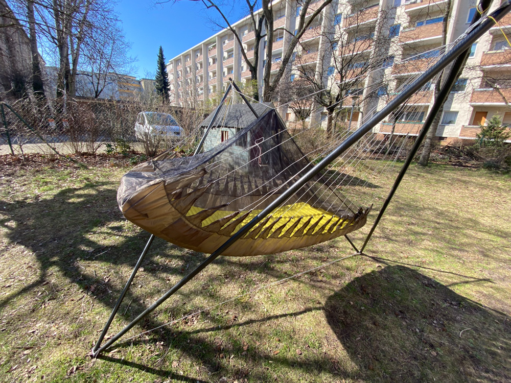 hangloose Der Stoff ist durch die 80 den Ripstopfäden erstaunlich wenig stretchig. Viel ausprobieren konnte ich ihn allerdings nicht. Vielleicht gibt es ja irgendwann einen Erfahrungsbericht von Hammock Fairy. Rein vom Gewicht her geht es sicher noch leichter, z.b. Cloud71 mit 0.5er Moskitonetz. Das werde ich dieses Jahr auch noch mal ausprobieren und schätze, damit unter 200g zu bleiben. Aber das fällt alles unter Sonderanfertigung für Leute, die mit stretch kein Problem haben.