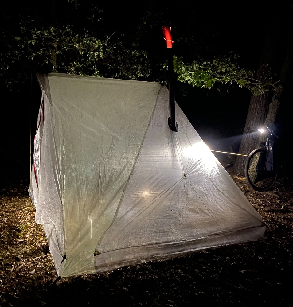 Da das Wetter uns den Gefallen tat, noch einmal Altweibersommer zu spielen, bin ich gestern Abend schnellentschlossen zum allgemein bekannten Platz an der Havel geradelt und habe dort im Schein der Fahrradlampe Hängematte und (auch 10° sind nicht mehr wirklich warm) Zelt aufgebaut.