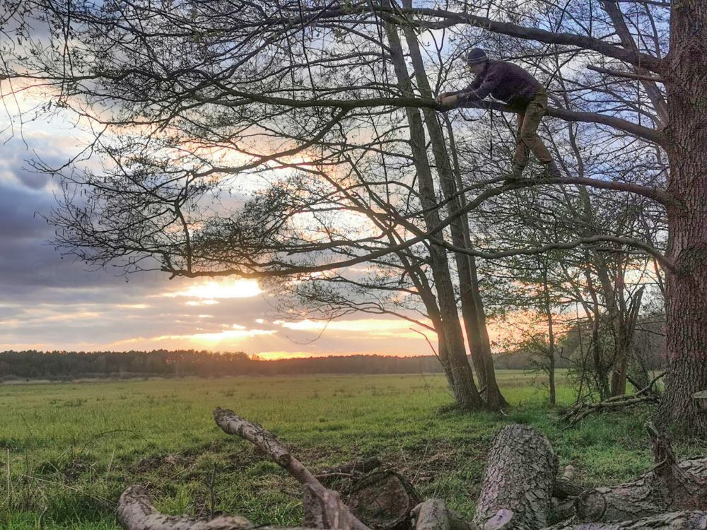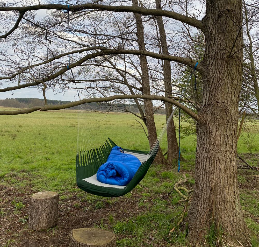 Bei einer Übernachtung am Ufer der Müggelspree hatte ich gestern eine herausfordernde Situation: Die Baumabstände waren für meine Gurte alle viel zu groß, aber es gab einen Baum mit weit auskragenden, aber leider auch dünnen Ästen. Deshalb musste ich den Baumgurt zunächst ein Stockwerk höher um einen Ast schlingen, damit die Belastung auf zwei Äste geht.