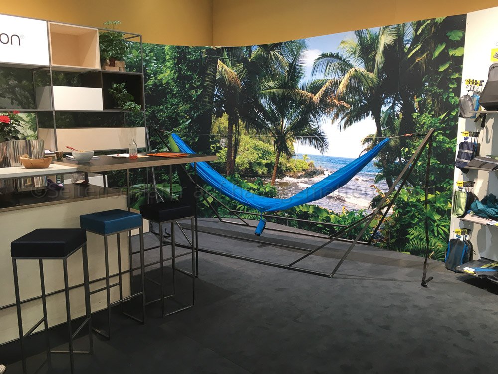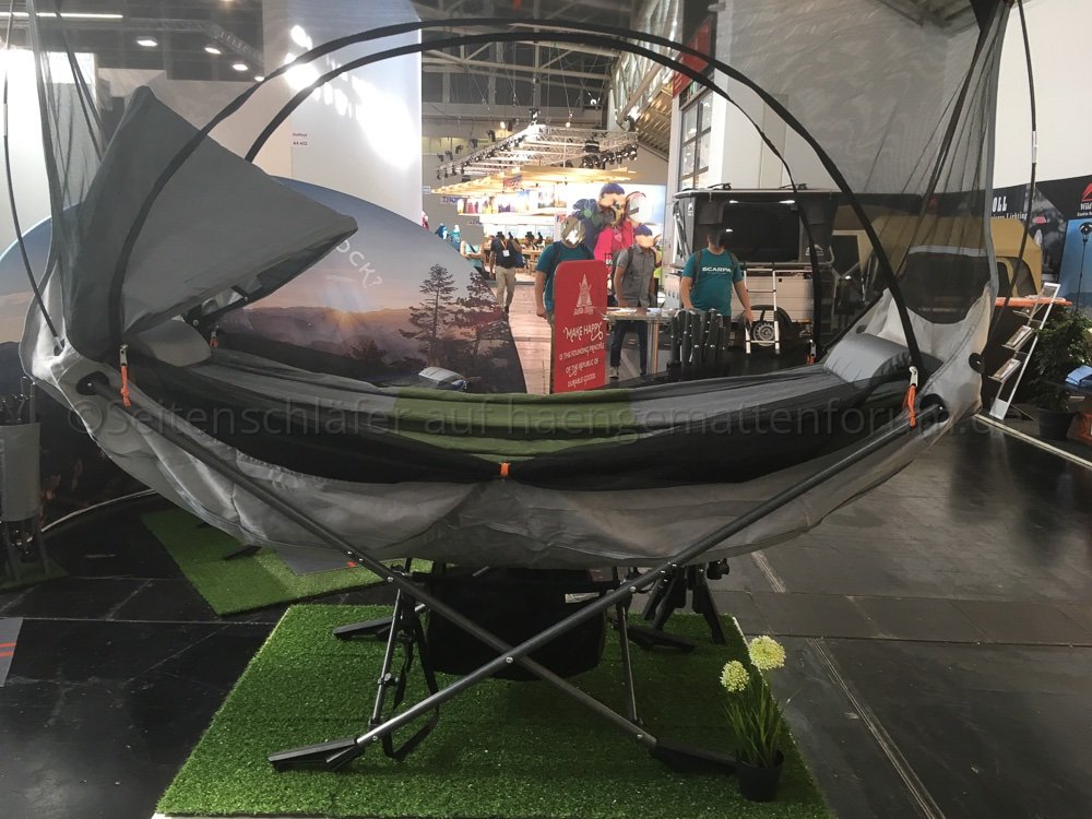 Bei Amazonas, am Nachbarstand, saßen zwar zwei nette Jungs, aber die aufgebaute UL-Hängematte mit - ziemlich schwerem - UL-Underquilt konnte man nicht benutzen. An beiden Ständen war man überzeugt, dass 3-3,20 m Länge ausreichen.
