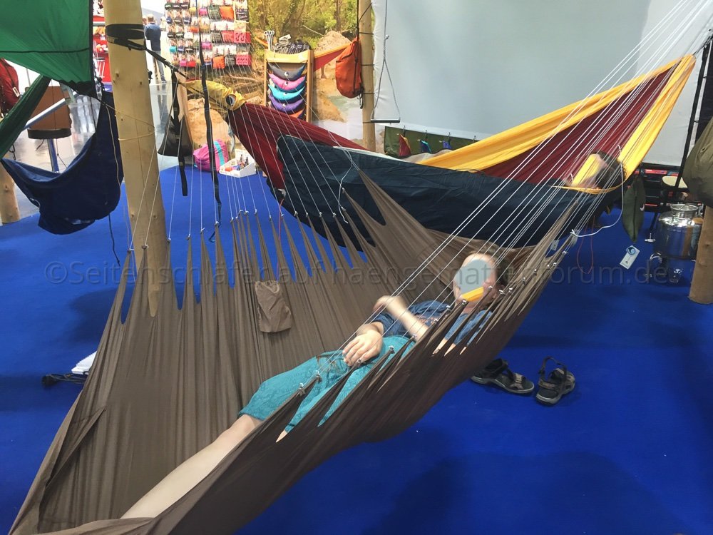 Ich komme gerade von der Outdoor-Messe in München zurück und will kurz hier meine Eindrücke schildern. Zunächst: Hängematten sind auf dieser, erstmals in München gezeigten Messe absolut unterrepräsentiert. Ab besten gefiel mir der Stand von TTTM, mit denen ich sehr interessante Gespräche geführt habe und die auch die Cross Hammock (kurzzeitig) aufgehängt haben.