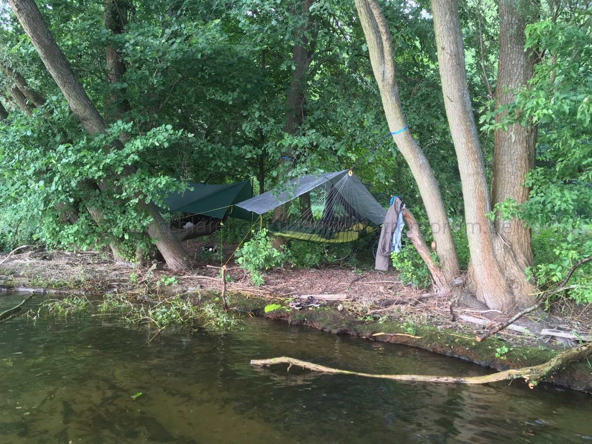 Das Tarp war da nicht zu sehen, auch die Hängematte mit UQ war nur an dünnen Demo-Stämmchen aufgehängt und nicht zu benutzen.