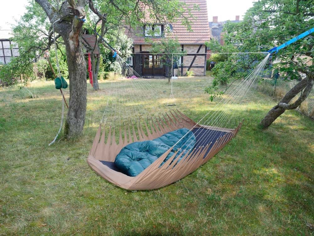 Die Überlegung ist eigentlich, durch die eingenähte Apex-Isolation den Underquilt einzusparen. Ich bin von dem gestern Abend fertig gewordenen Prototyp begeistert, obwohl ich noch ausprobieren muss, wie man darin eine ganze Nacht schläft. Der Nachteil der Konstruktion ist ganz offenbar, dass diese Form der Cross Hammock ganz genau auf den Nutzer zugeschnitten werden muss. Wenn z.B. kürzere oder breitschultrigere Leute als ich die Matte nutzen, müssen einzelne Maße der Schnüre genau angepasst werden, sonst liegt man entweder im Hohlkreuz (so geht es meiner Frau) oder der Stoffdruck auf der Schulter wird zu groß oder - davon hat mir barfuß mal geschrieben - die Füße hängen runter, wenn man auf der Seite liegt. Ich bin momentan noch skeptisch, ob ich unter diesen Umständen ein Angebot für eine größere Nutzergruppe erstellen kann. Außerdem steht - ohne Isomatte - natürlich wiederum die Frage im Raum, ob man eine Cross Hammock Isolation für Leute, die mehr als ich mit meinen 75 kg wiegen, überhaupt anbieten kann, ohne Schäden an Matte und Gesundheit zu riskieren. Es gibt also noch viel zu tun.