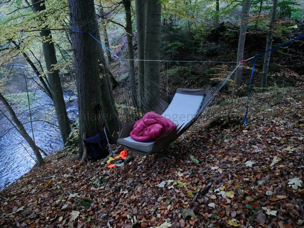 Kurz vor dem oberen Bildrand habe ich dann die erste Nacht verbracht - am Steilhang direkt an der Bode. Anders als in der Hängematte wäre es kaum gegangen, wenn man nicht unmittelbar auf dem Weg gezeltet hätte. Ich bin einmal mehr froh gewesen, dass ich mit meiner 90°-Matte einen relativ kurzen Baumabstand nutzen kann. Mit einer normalen Gathered End Hängematte wäre das schwierig geworden. Die Nacht war so lau, dass ich beschloss, kein Tarp aufzuspannen. Es gab zum Glück sogut wie keinen Tau, sodass mir der lästige Nässefilm auf dem Daunenschlafsack erspart blieb, mit dem ich diesen Sommer so manches Mal zu kämpfen hatte.