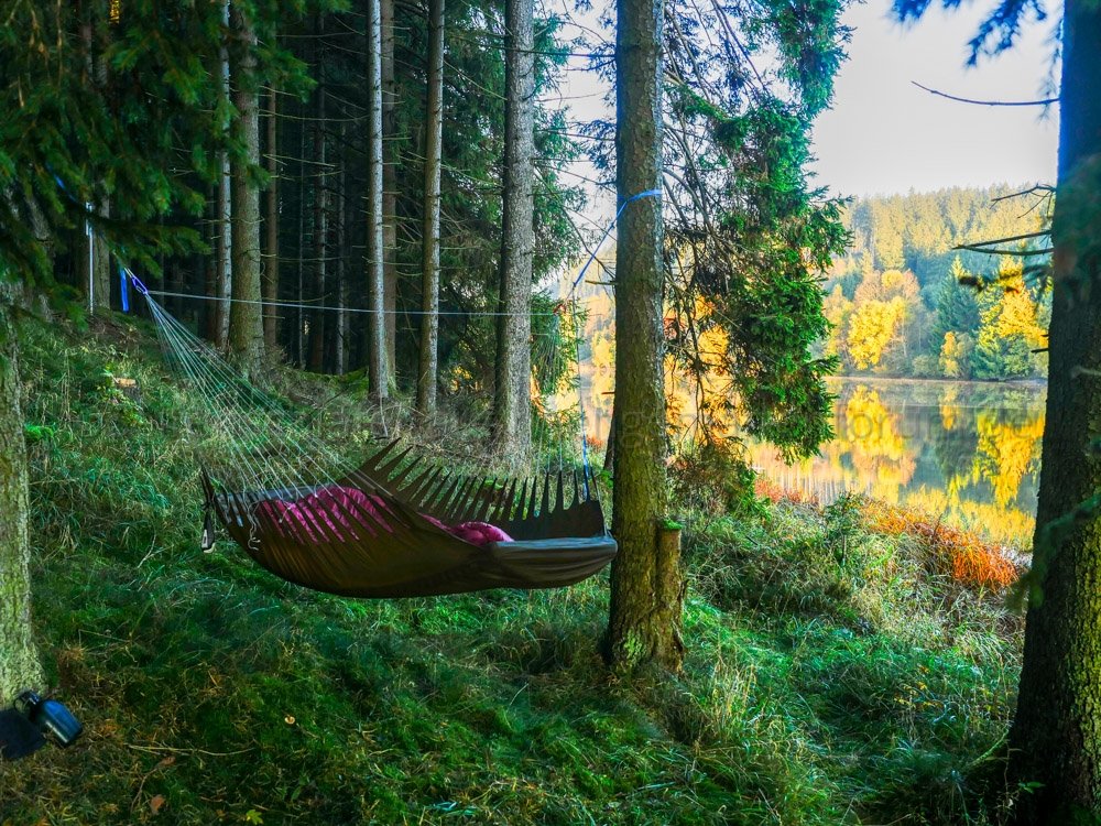 Die folgende Nacht habe ich an der Überleitungssperre Königshütte campiert, natürlich wieder in der Hängematte. Das Foto vom Schlafplatz ist zwar etwas HDR-mäßig angekitscht, aber die Aussicht auf den langsam im Morgenlicht aufleuchtenden Mischwald am Ufer gegenüber kriegt man nur so aufs Bild. Was ich damit sagen will: Leute geht raus in die Natur, so schön wie jetzt gerade wird es dieses Jahr nie wieder!