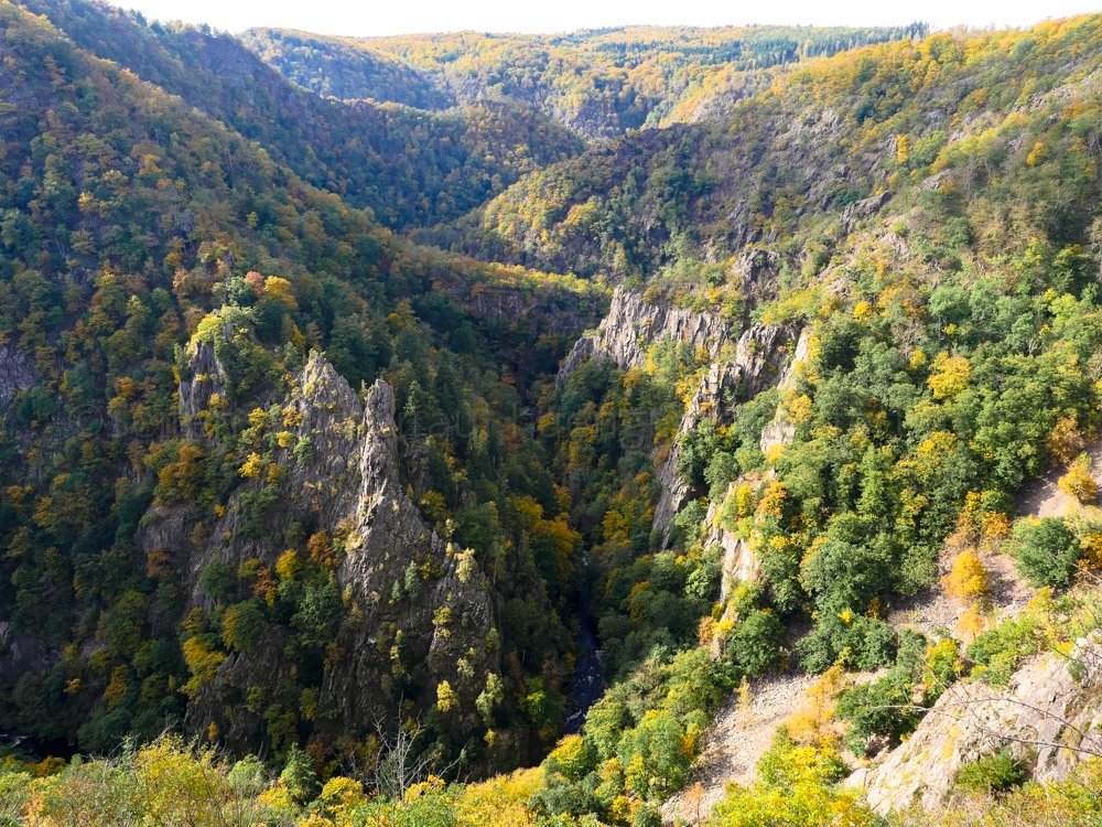 Inspiriert vom mitteldeutschen goldenen Oktober bin ich letztes Wochenende von Thale bis Drei Annen Hohne im Ostharz wandern gewesen und möchte davon hier ein paar Eindrücke loswerden. Los ging es in Thale mit der Gondel hinauf zur Roßtrappe. Von dort hat man nicht nur eine ziemlich spektakuläre Aussicht in das steilste Felsental Deutschlands nördlich der Alpen, sondern überblickt auch fast das erste Viertel der Wegstrecke bis Treseburg.