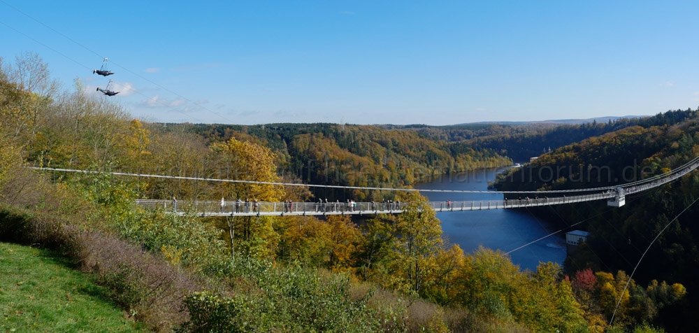 Am nächsten Tag führte der Weg dann über die Rappbodetalsperre und damit vorbei an der Titan RT, die von Mai bis Juli diesen Jahres die längste Fußgängerhängebrücke der Welt war. Drüber zu gehen habe ich mir verkniffen, denn dafür hätte man 2 Stunden anstehen müssen - Zeit, die ich brauchte, um den Weg von insgesamt knapp 50 km bis zur Harzquerbahn zu schaffen.