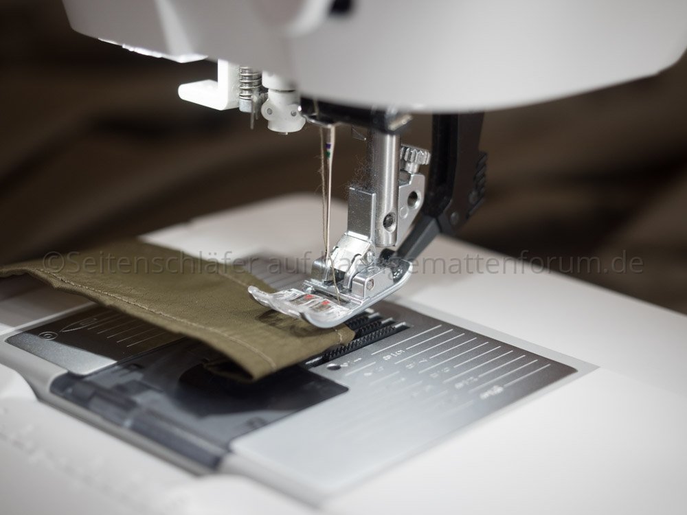 Genäht wird ein Saum um die Außenkante und danach die Tunnelzüge für die Aufnahme der Schnüre