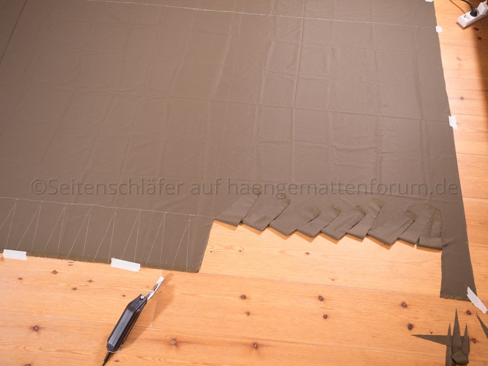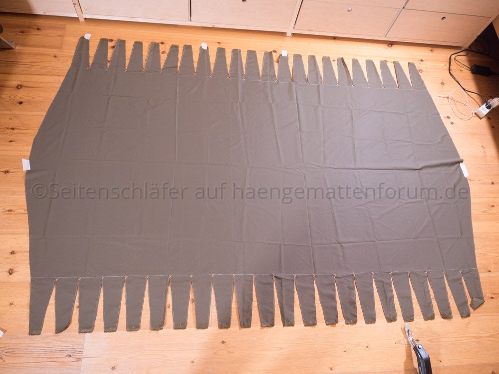 Ich habe mich an der Breite des Hexon-Stoffes orientiert (154 cm). Die Zähne sind ca. 20 cm lang, bleiben für die Matte also ca. 110, wenn man ca. 4 cm für die Schnüre doppelt umschlägt. Leider bin ich dem Rat gefolgt, die Matte - entsprechend der Hammocktent 2.0 - etwas länger zu machen und habe auf 230 cm verlängert. War aber nicht nötig, werde zu 220 zurückkehren.