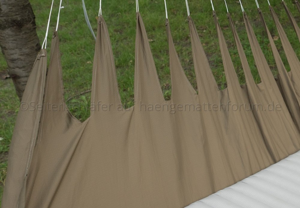 Diese Information erreicht mich grade rechtzeitig, weil ich überlege, wie ich den Schnitt eines Moskitomattenmodells aus Hexon 1.6 designen soll. Diese Haifischzahn-Lösung ist eigentlich die logische Fortentwicklung der Exped-Scout-Aufhängung, die Treegirl im Thread zu meiner 90°-Matte gepostet hatte. Man braucht kein Gurtband mehr und muss nicht ganz soviel nähen wie für die Exped-Scout. Ich frage mich - und die Nähexperten im Forum - jetzt noch zwei Sachen: