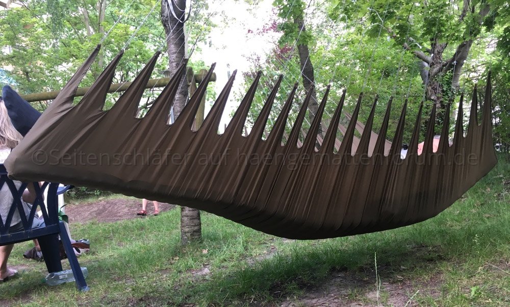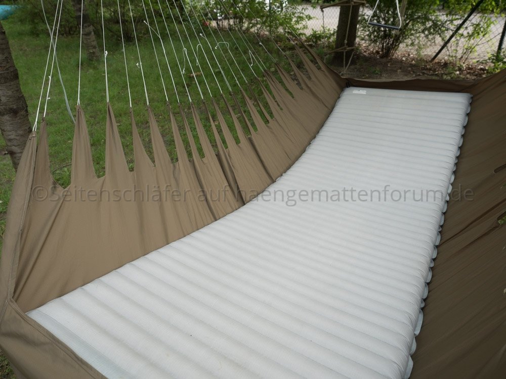 Ja, sieht super aus! Ich fachsimpele mit meinem Berliner Hammocktent-Kompagnon häufig über die beste Aufhängelösung. Bei seiner Matte ist das Kopfteil ähnlich hochgezogen wie bei dir. Nur dass bei dir dazu noch die Fußpartie sehr schön eben ist. Bei meiner alten wie neuen Matte liegt der Kopf etwas tiefer als die Füße. Das ist nicht ganz optimal, aber mir scheint es kaum vermeidbar zu sein, wenn man mit dem Kopf etwas ebener liegen möchte. Aber ich muss jetzt erst mal entscheiden, ob ich die beiden überzähligen Zähne der neuen Matte noch absäbele und auf 210 verkürze.