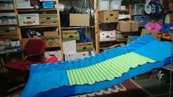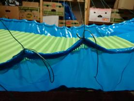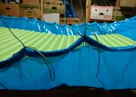 Nachdem mein 90° Prototyp ganz gut zu liegen war, hab ich mich gestern an die Herstellung einer Version 1 gewagt. Nachdem ich einige Kilos auf die Waage bringe, war ich auf der Suche nach einem System, mein Gewicht möglichst gleichmäßig auf den Stoff zu übertragen. Deshalb habe ich (ist natürlich nicht ultraleicht) zwei Gurtbänder auf beiden Seiten verwendet. Eines, um das ich das Stoffende gewickelt und damit gesäumt habe, und eines, in das ich 1mm Dyneema als Schlaufen genäht habe. Beide hab ich dann gut vernäht. Macht bei 20 Schnüren pro Seite 40 Abspannungspunkte an der Matte.