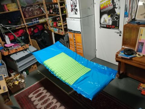 Ich versuch mich jetzt auch mal an einer 90° Matte. Weil ich noch etwas blaue Ikea Folie rumliegen hatte, eben aus dieser. War eine nette Abendbeschäftigung und liegt es sich gar nicht so schlecht. Die Schnurlängen hab ich jetzt nur mal grob geschätzt, da ist sicherlich noch Potential.