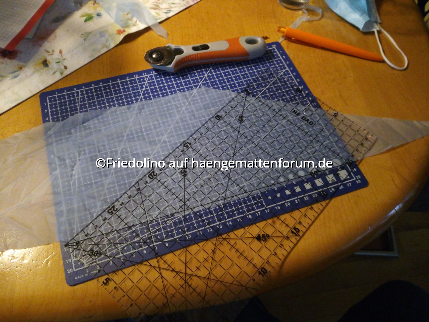 Aus einem Stoffrest ein gleichschenkliges Dreieck zuschneiden. das urdprüngliche hatte laut Plan an den schmalen Seiten ca 15cm, an der Basis 30cm Kantenlänge. Beim schneiden muss natürlich Zugabe für den Saum dazu. 2cm an allen seiten. Die resultierenden Kantenlängen kann man mit Trigonometrie ausrechnen. Habe ich letztes mal gemacht. diesmal habe ich die inneren Eckpunkte eingezeichnet und in 2cm Abstand die Kanten abgeschnitten.