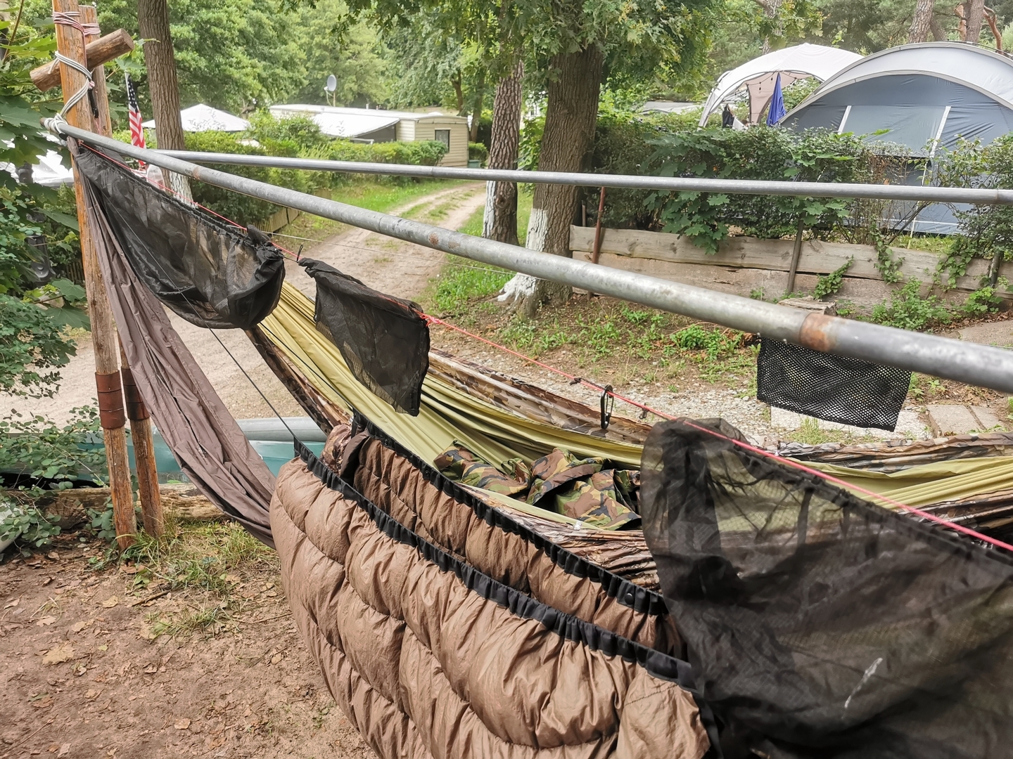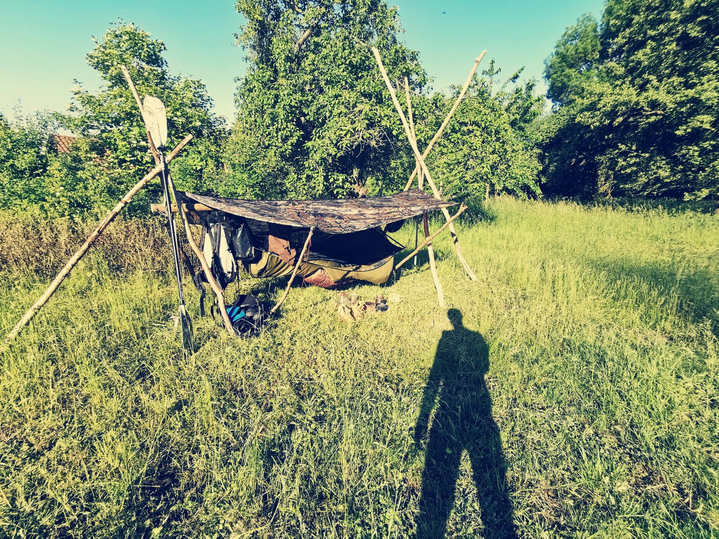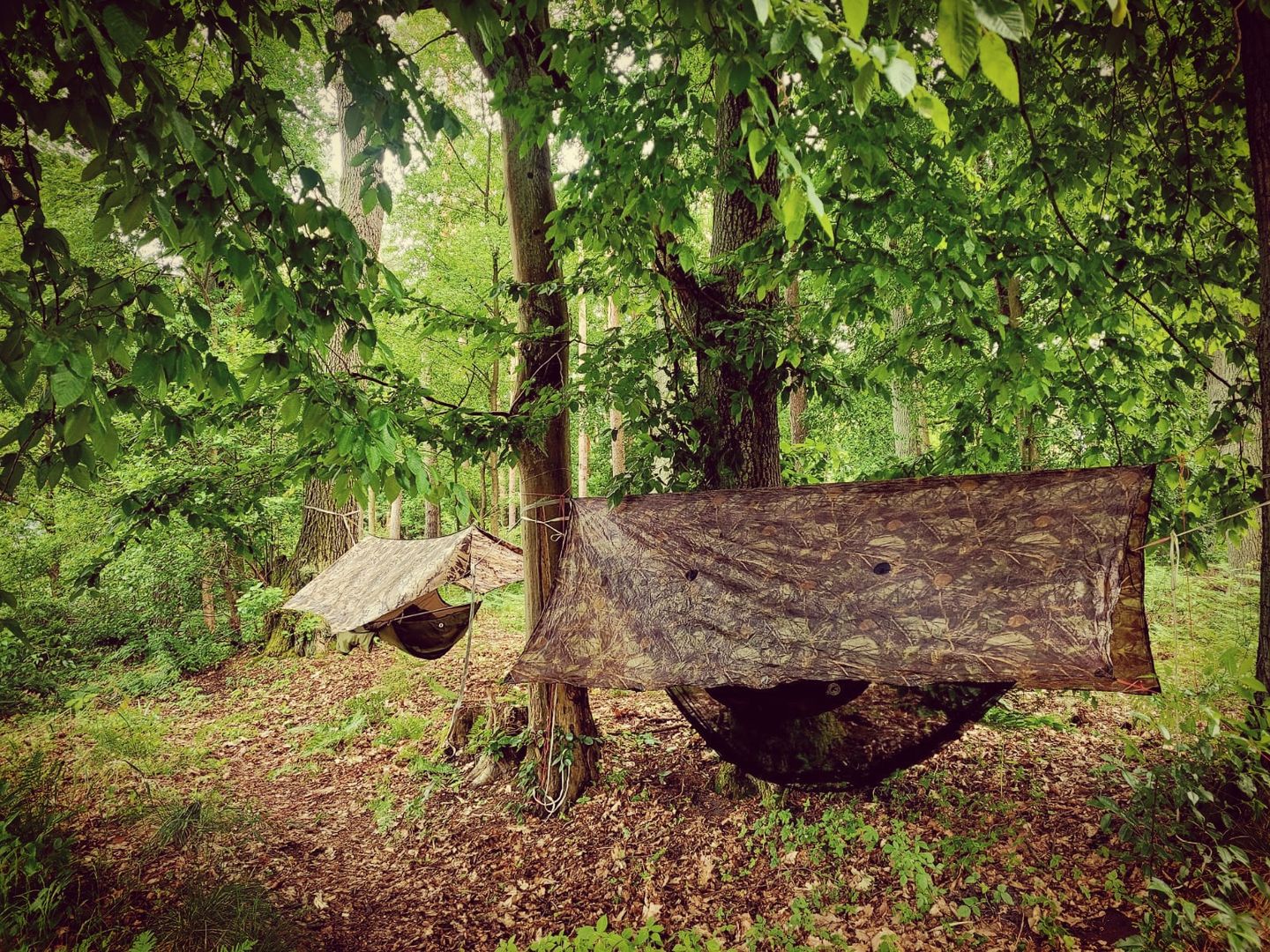 Spätabends mit viel Gepäck durchs Unterholz geirrt, haben wir die Nächte auf der schönen Wiese am Boden verbracht. Manchmal mag ich das auch ganz gerne. Aber gerade erst hat mir meine Freundin nahegelegt, dass es bei der nächsten Tour unbedingt wieder die Hängematte sein muss