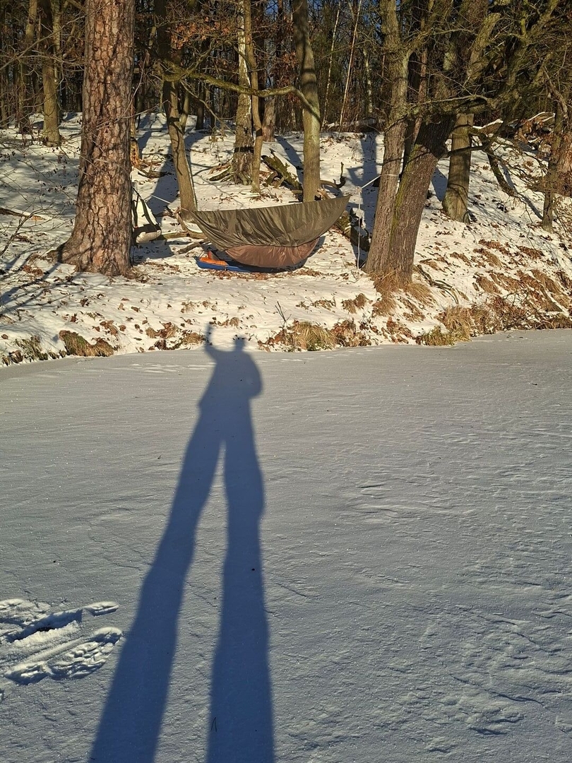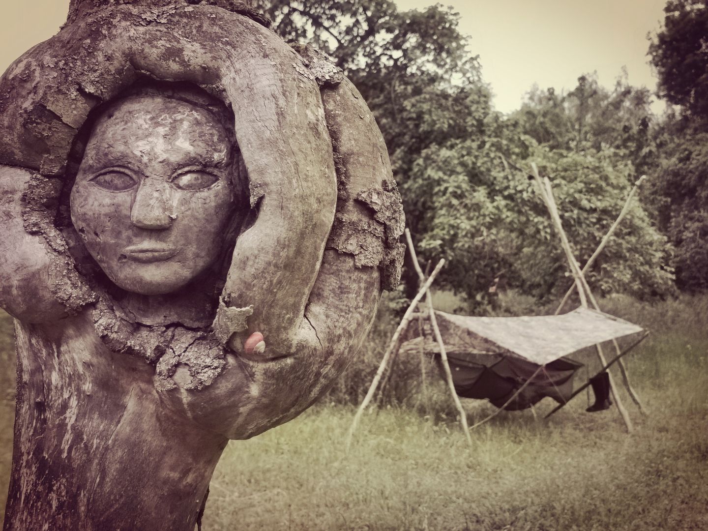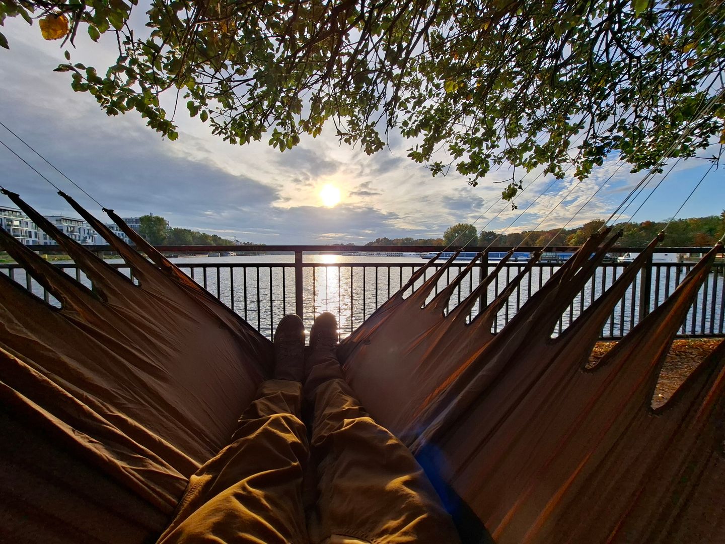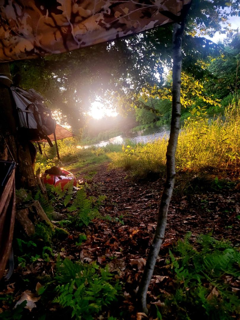 Spätabends mit viel Gepäck durchs Unterholz geirrt, haben wir die Nächte auf der schönen Wiese am Boden verbracht. Manchmal mag ich das auch ganz gerne. Aber gerade erst hat mir meine Freundin nahegelegt, dass es bei der nächsten Tour unbedingt wieder die Hängematte sein muss