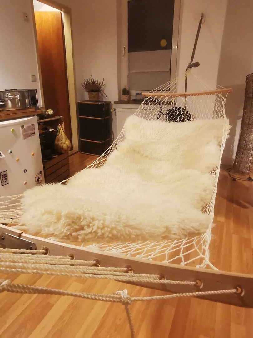 Was ich gut finde, ist mit der Hängematte dort zu sein wo die Wärme hingeht. Und gemütlicher als auf dem Boden ist es auch. Keine Frage.
