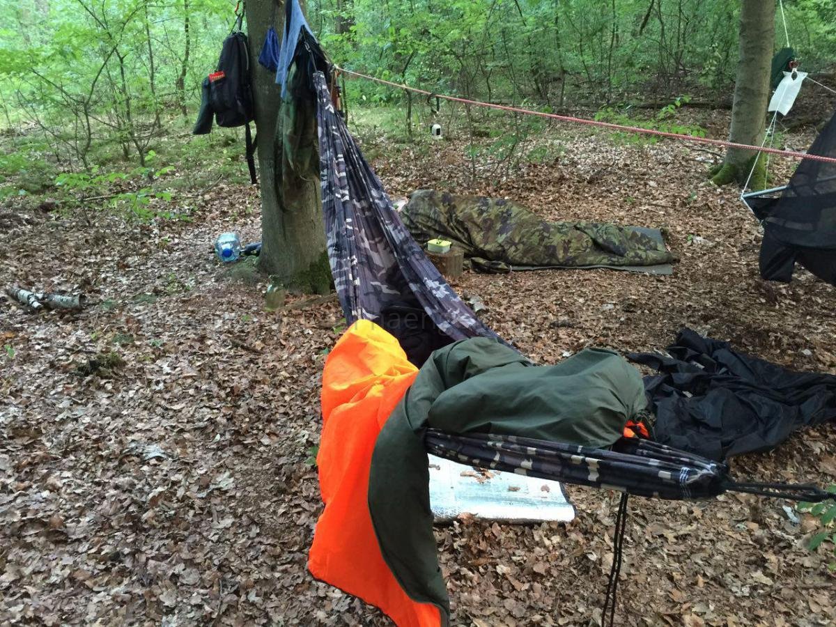 Aber alles Gut und die letzten Meter wurden geschafft. Eine Stunde Zeit hatten wir, bis die Dämmerung einsetzen würde und so begannen wir mit dem Lagerbau. Um uns herum war ein Kiefernwald aber bei unserem Platz waren Birken, und Buchen und alles noch relativ junge Bäume, so dass keine Witwenmacher zu fürchten waren.Der Aufbau meiner Bridgehammock (BH) ging diesmal besser als beim ersten Feldversuch. Auch der Daumen/Zeigefinger Test (Winkel) war in Ordnung.