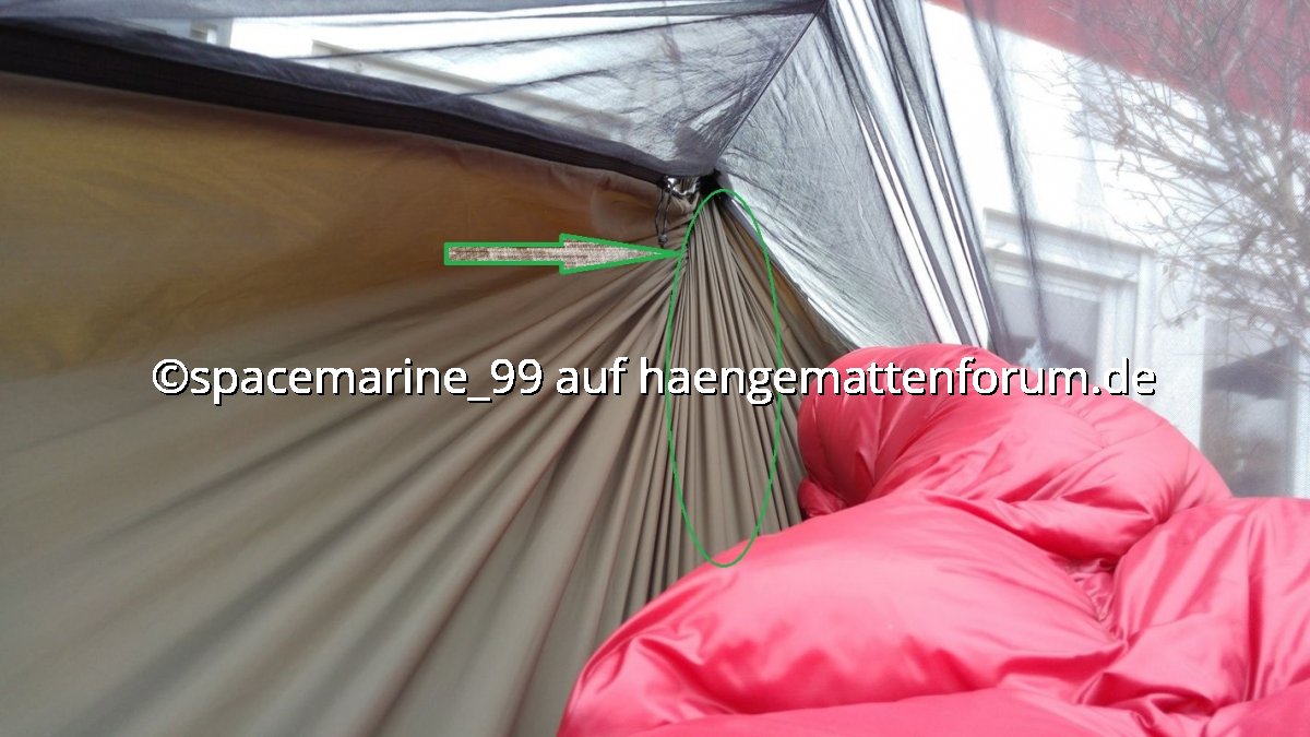 Ich habe mit X-verschiedenen Einstellungen (Aufhängungs- höhe, -länge, winkel, stramm oder schlaff spannen) versucht es so hinzubekommen, dass ich mich so in die Hängematte lege, dass die Druckstelle für mich nicht so unangenehm ist. Hierbei habe ich allerdings nur die Möglichkeit gefunden, die Füße über die Hängemattenseite ins Moskitonetz zu legen. Da hab ich allerdings meine Bedenken, ob das das Moskitonetz lange mitmacht.