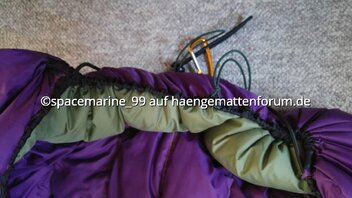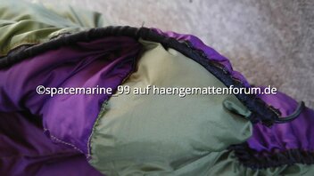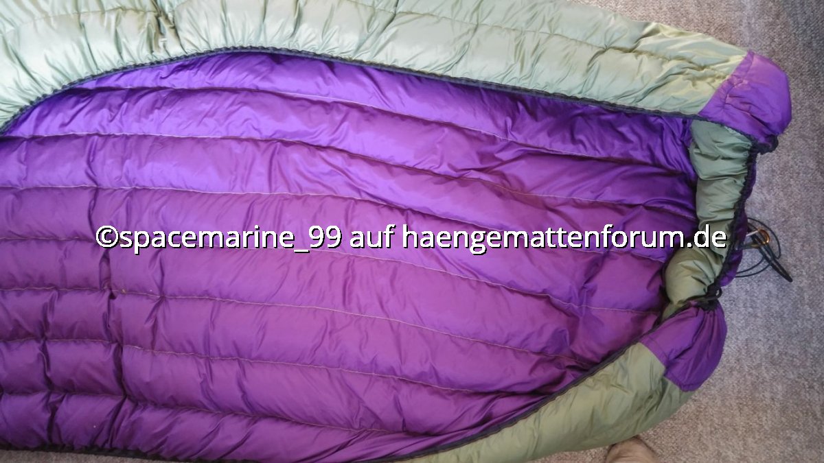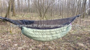 Hier kurz meine Einschätzung zu den beiden Daunen: Die 700er Daune isoliert ganz ordentlich, bauscht allerdings tatsächlich um einiges weniger als die 860er, ist dafür aber formstabiler. Für die gleiche Isolierung muss also auch das zusätzliche Gewicht in Kauf genommen werden. Kostentechnisch bleibts somit fast beim gleichen, da man doch einiges mehr an Daunen benötigt (ich glaub der Unterschied ist zwischen 5 und 10 Euro). Für UQ und TQ oder Schlafsäcke im Allgemeinen würde ich nur noch die 860er Daune verwenden. Für Kleidung würde ich definitiv die 700er Daune verwenden. Hierbei benötigt man zum ersten nicht ganz so viele Daunen, so dass der Gewichtsunterschied kaum spürbar ist und die Formstabilität m.E. ein Vorteil ist.Um wieder zu meinem UQ zurück zu kommen: Im großen und ganzen bin ich zufrieden, habe aber jedoch einiges an Verbesserungspotenzial entdedeckt. Im Endzustand ist der UQ leider nicht ganz knapp 2 Meter lang, und somit zu kurz. Die Aufhängung muss definitiv noch verbessert werden, da dies nur mit Müh und Not vernünftig funktioniert. Der UQ hängt lediglich an einem rundum laufenden Gummiseil welches an den Hängemattenenden eingehängt wird, strammziehen kann ich es leider nicht. Hier muss ich noch was gescheites annähen, hab aber noch keine richtige Lösung gefunden bzw. ist mir noch nicht eingefallen. Bei 5°C bereits getestet und wenn die Aufhängung im langwierigen Prozess vernünftig geknotet wurde ziehts auch nicht rein. Er ist auf jeden Fall dann noch warm genug um mit T-Shirt und nackigen Beinen in der HM zu liegen. Aufgrund der Kürze habe ich das Problem, dass er gerade am Ende bei den Beinen immer verrutscht und nicht richtig sitzt.