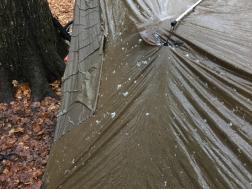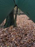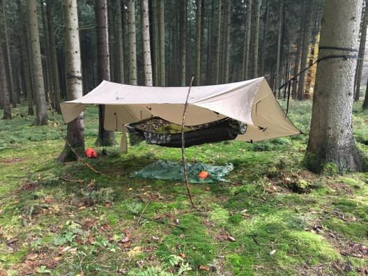 5 Minuten entfernt hatte Dirk unser Lager geplant, ein schöner Laubwald mit vielen großen Buchen. Leider aber auch ziemlich feucht und der Boden total aufgeweicht. Wir bauten also im Dunkeln unsere Hängematten im Dreieck auf, in der Mitte ein Tarp zum Kochen und Aufenthalt.