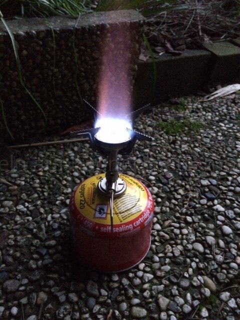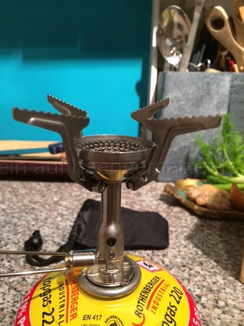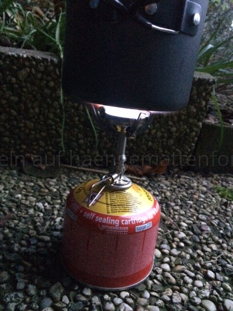 Der kleine hat keinen Piezo Zünder. Also Feuer-(Stahl) nicht vergessen! Brennen tut er wie ein Bunsen-Brenner - Senkrecht und gut hörbar!