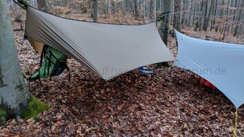Ich spanne mein Minifly mit 6 Schnüren ab. Die 4 Abspannpunkte mache ich mit an den Heringen befestigten Schnüren an denen je eine Cord Claw sitzt. Die wird am Tarp in eine kleine Schlaufe aus elastischer Kordel eingehakt und so ist es echt einfach zu spannen. Die kleinen Türen spanne ich ebenfalls am Baum ab. Leine mit Dutch Hook an den Baum und am anderen Ende wieder Cord Claw ( ja ich find die einfach nur gut...). An den Türen habe ich einen der Warbonnet Karabiner die dabei waren mit elastischer Kordel. Damit clipse ich die Türen zusammen und in die Kordel wird die cord Claw eingehakt. Bei gutem Wetter Cord Claw aushaken und Türen mit Karabiner über dem Tarp zusammenbinden.