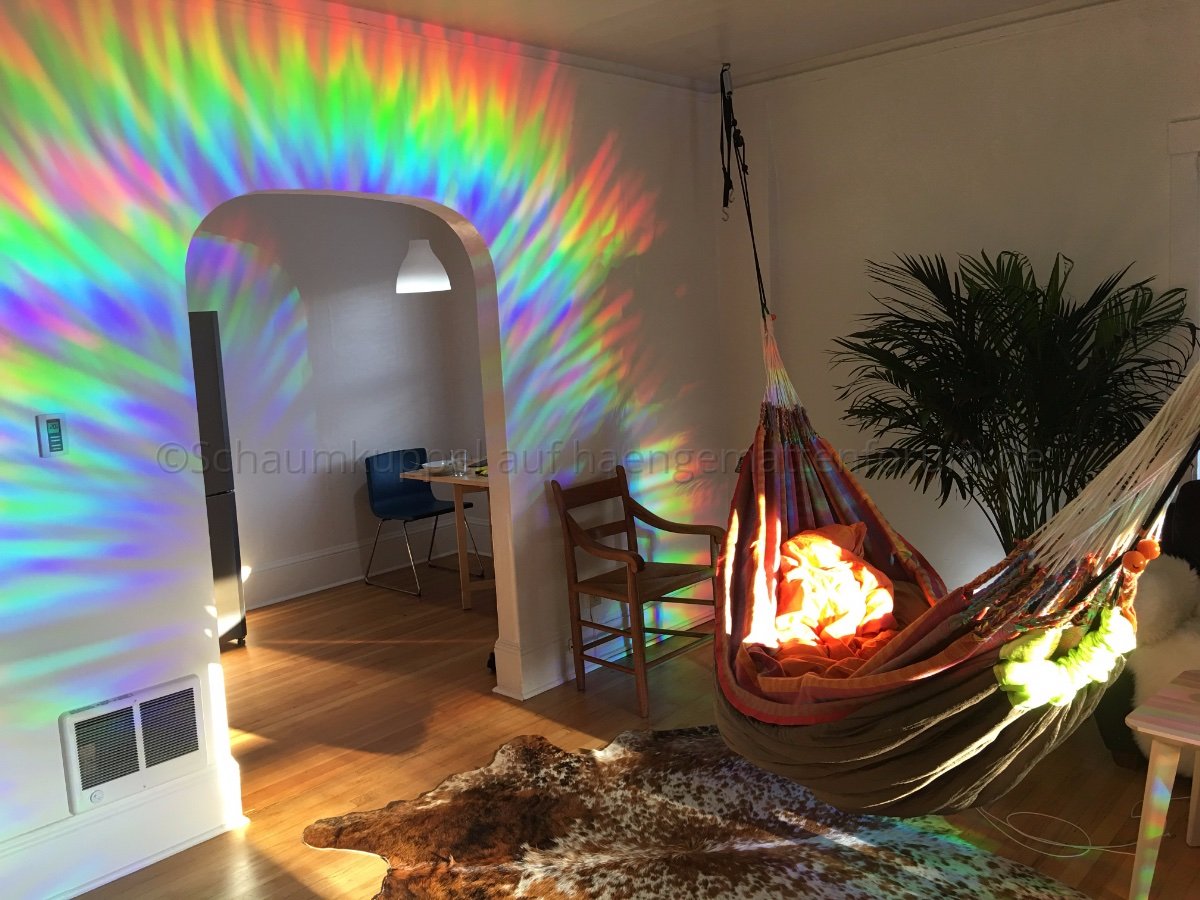 Haben Sie an ein Tensahedron gedacht? Funktioniert gut für 90° Hängematten (fragen Sie Seitenschläfer). Könnte aus 4 Holzstäben von 2,5M Länge und 5cm Durchmesser hergestellt werden. Tagsüber schnell zusammenklappbar, um in einer Ecke mit noch befestigter Hängematte zu stehen. Schwerkraftanker auf beiden Seiten könnten ziemlich leicht sein, da bei einer 90°-Hängematte das Ganze im Gleichgewicht bleibt und sich nicht kopfüber lehnt, so dass die Spannung der Ankerleine gering ist.