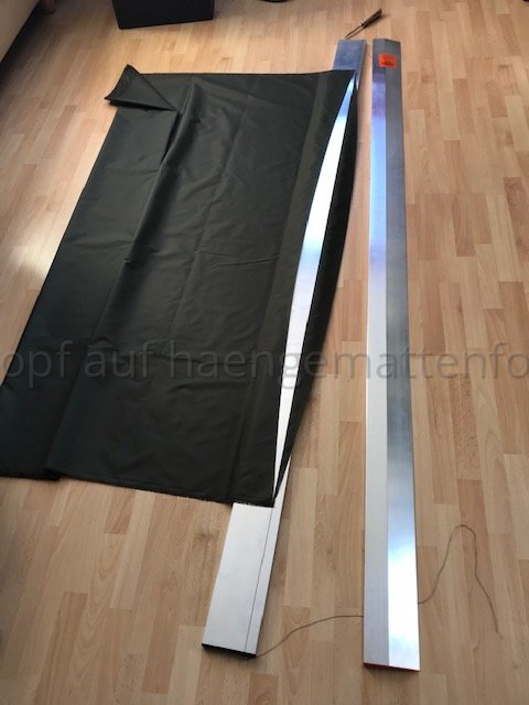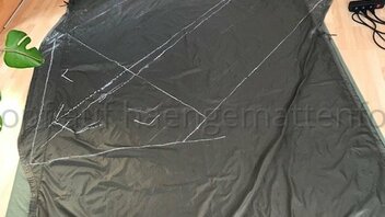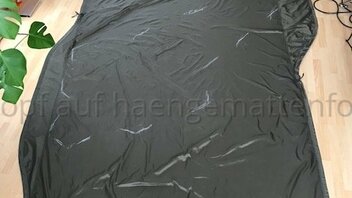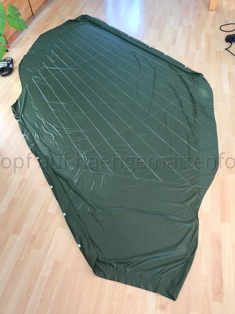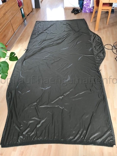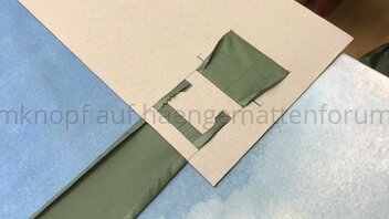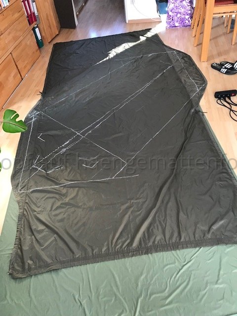 Zur Erklärung: mein Wooki-Klon ist aus einer daunendichten Kopie meiner HM entstanden. Auf der habe ich einen Umriss von mir in der HM liegend zeichnen lassen (von unten, fühlt sich doof an). Davon ausgehend habe ich ein Schnittmuster der isolierten Fläche konstruiert. Die die Stege (aus dem gleichen Stoff; ich hatte kein Moskitonetz) habe ich an die obere Lage genäht. Dann habe ich dann einen Steg nach dem anderen an meine untere Stofflage (in der ich gemäß dem catsplat calculator genügend Quer-Differenzial gelassen habe) genäht. Zum Schluss habe ich die untere Stofflage rundherum an die obere Lage genäht (natürlich eine kurze Kante nach dem Füllen der Kammern...)