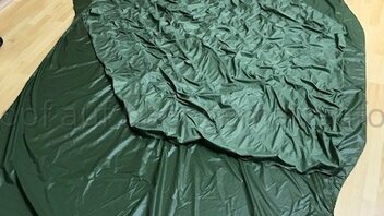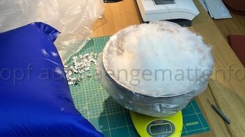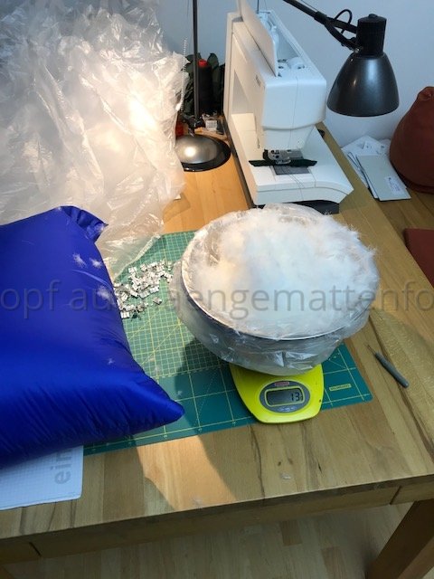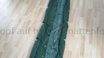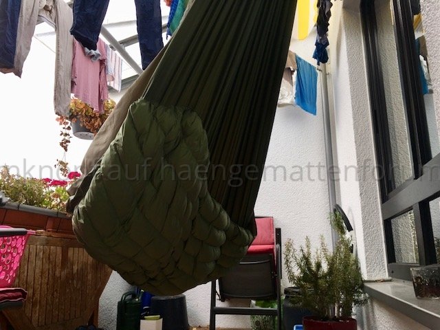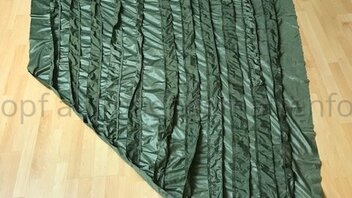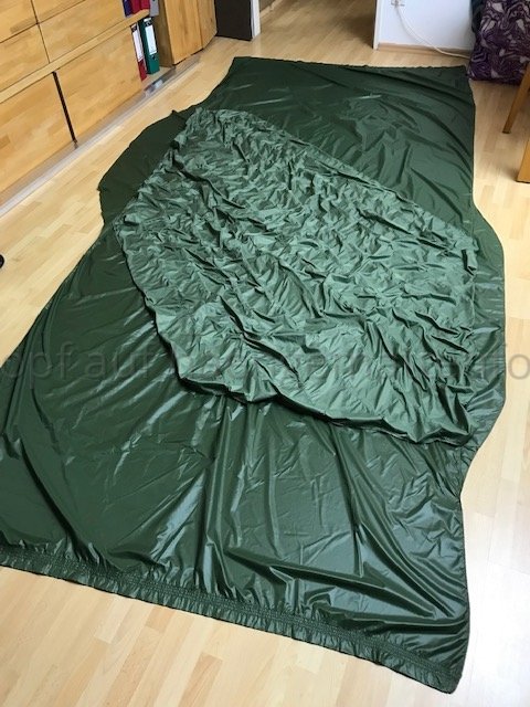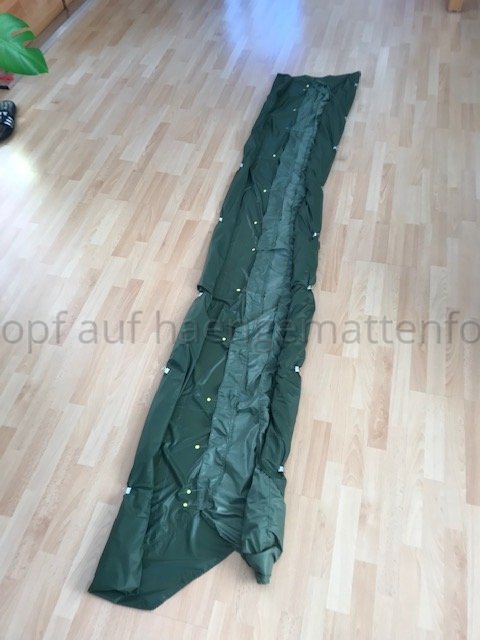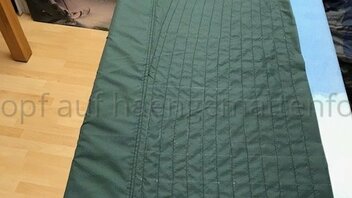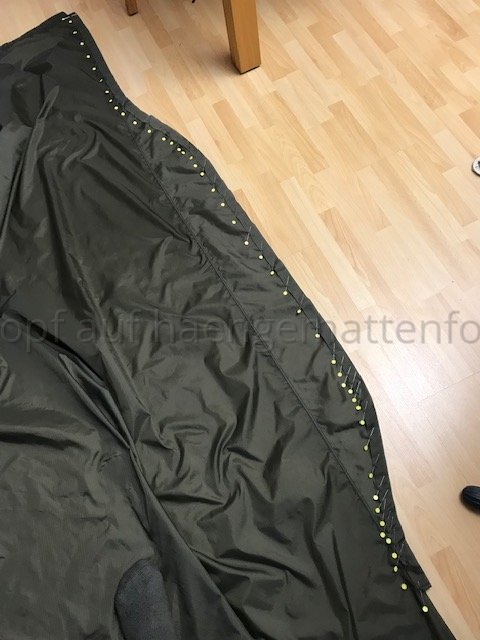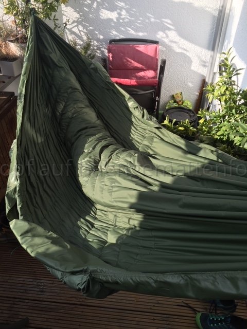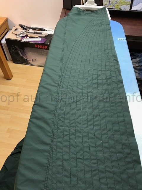 Kurzum, Wenn ich in der HM liege, komprimiert aber meine unter Lage die Daune etwas, da sich die obere Lage insbesondere im Bereich der Hüfte LÄNGS dehnt und die untere nicht. Bei kaltem Wetter habe ich eine Kalte Stelle an der Hüfte. Deshalb werde ich bei meinem nächsten Versuch die Stege an der oberen Kante durch regelmäßige Abnäher verkürzen und die untere Lage auch mit entsprechend LÄNGS-Differenzial konstruieren.
