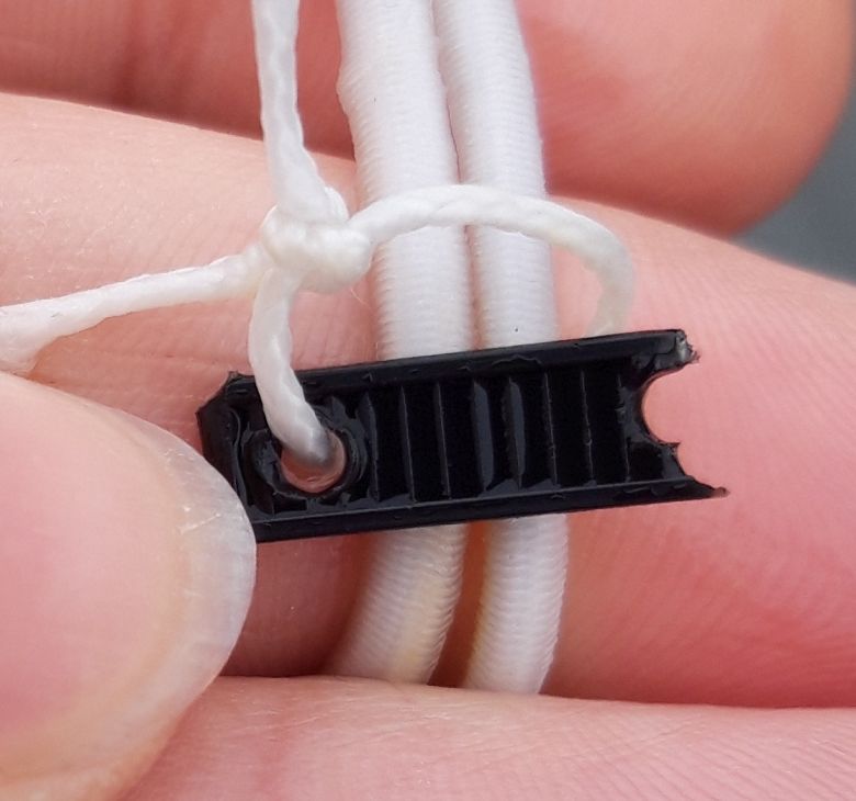 Bis jetzt habe ich nur die Dyneemaschnurr durch das Loch des Kabelbinder-Wurms-mit-Kopf gezogen und feste, ruckartig dran gezogen, sowie die Schnurr auf Spannung schnell durchgezogen (Reibungshitze). Alle ok, keine Veränderung.