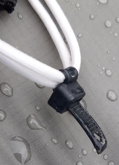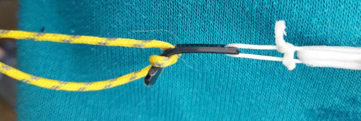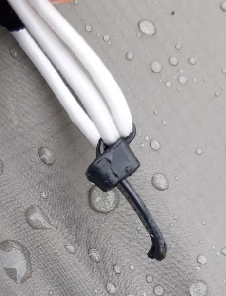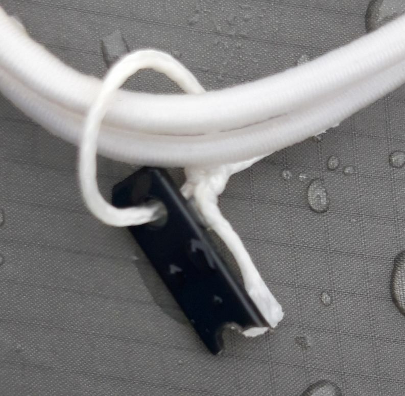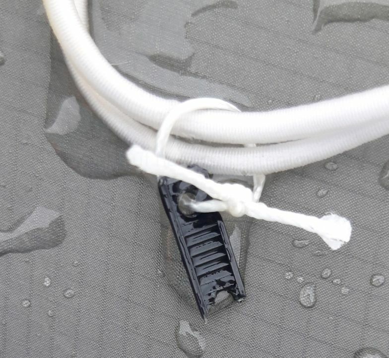 Erst wollte ich einen Kabelbinder pro Gummiseil am Tarp festmachen und den Rest als Wurmfortsatz zum befestigen des Abspannseiles umbauen.