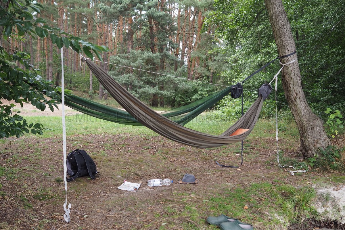Wenn die beiden Hängematten wie gezeigt "verbunden" sind merkt man wirklich fast jede Bewegung des Partners. Wenn dann einer Nachts mal raus muss, ist schon ziemlich viel Bewegung in dem System.