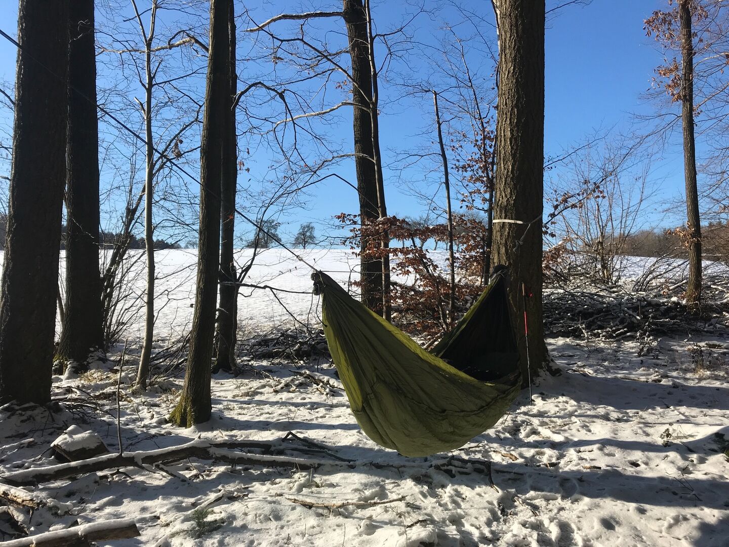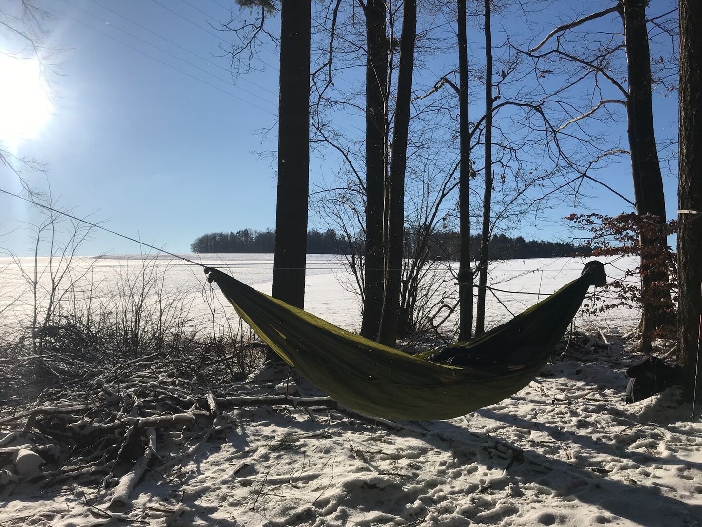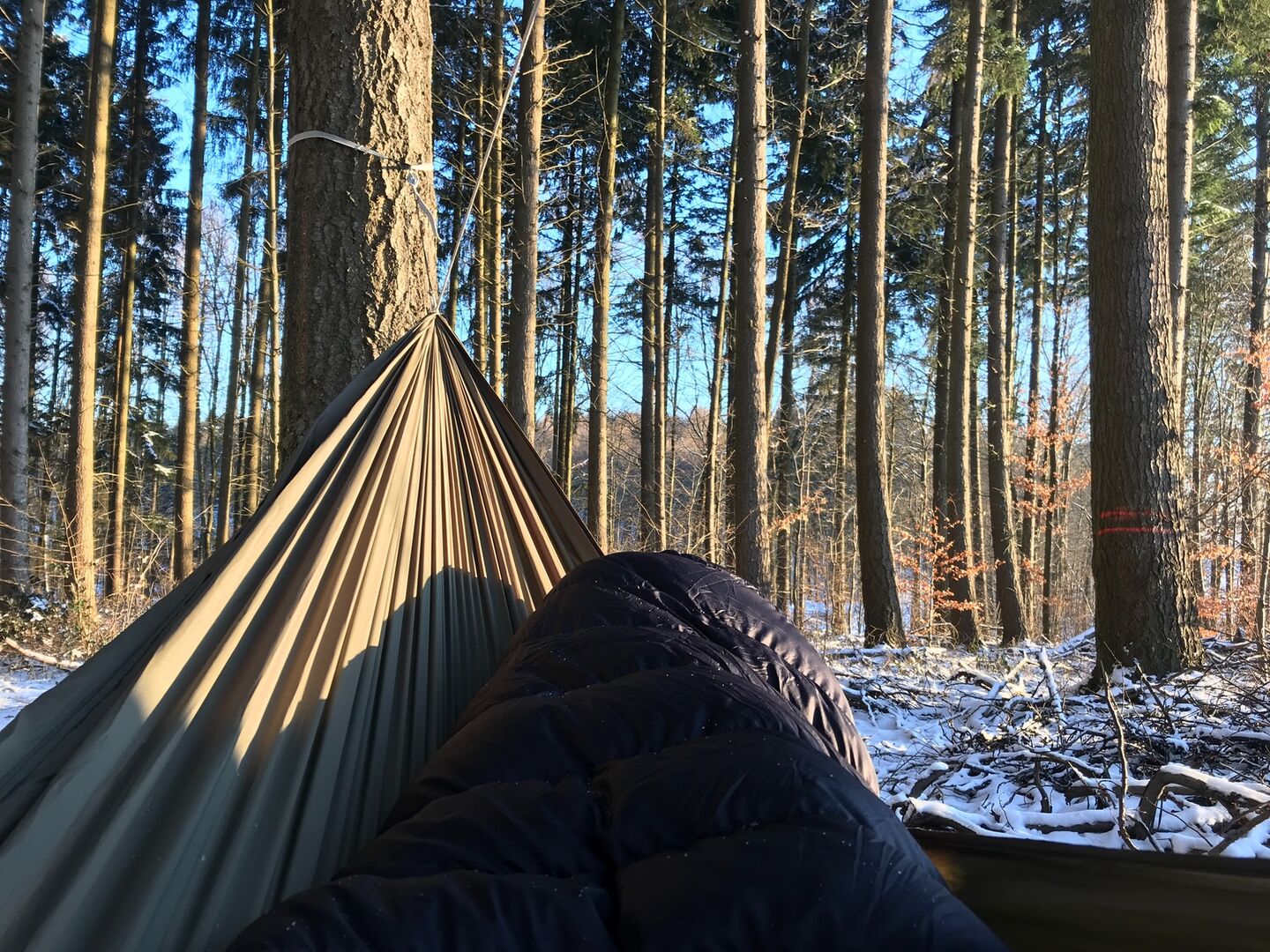 Waren auf einem One-Night-Hang im Wald mit einem Hängegefährten und seinen Hunden. Bier und Wurst und Kaffee und Brötchen gabs auch...
