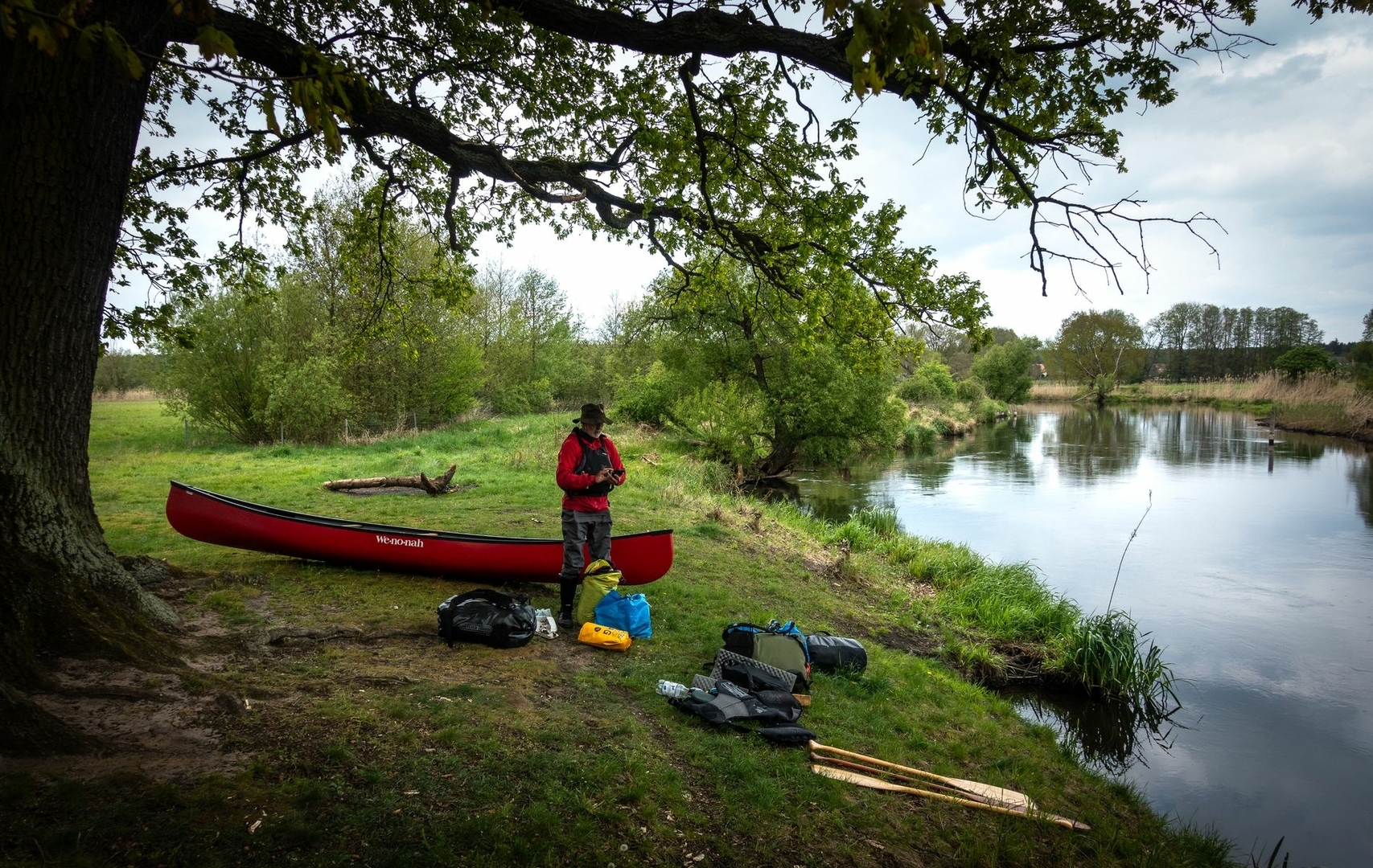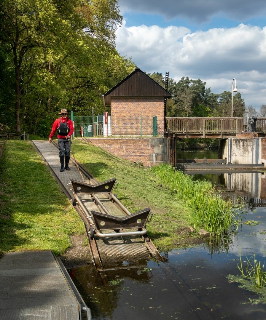 An der Großen Tränke am Abzweig in den Oder Spee Kanal wird mit einem Bootswagen das Canoe in den ursprünglicheren und schönen Teil der Spree gewechselt.