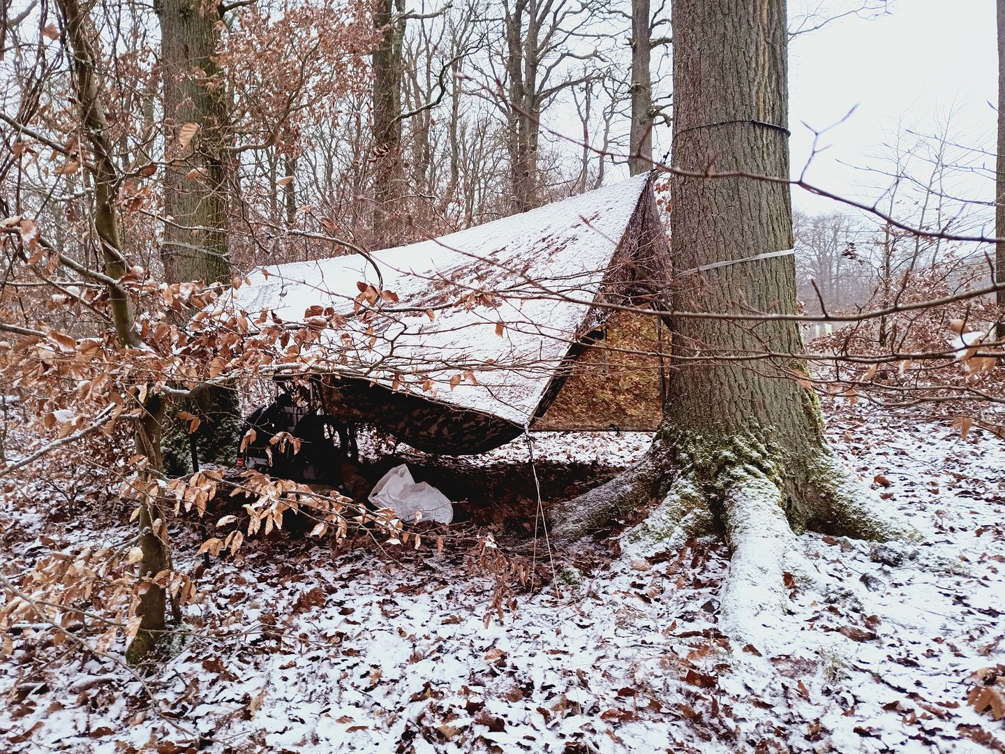 Das Timing war perfekt und das Dach war gebaut bevor der erste ernsthafte Schnee runter kam. Nach 15 Minuten war der Spuk auch schon wieder rum und ich bin zum gemütliche Teil übergegangen. Der Schnee war ziemlich feucht und hat an allem regelrecht geklebt. Die Rückseite des Tarp war trotz steiler Abspannung gut mit Schnee bedeckt der nicht abrutschen wollte.