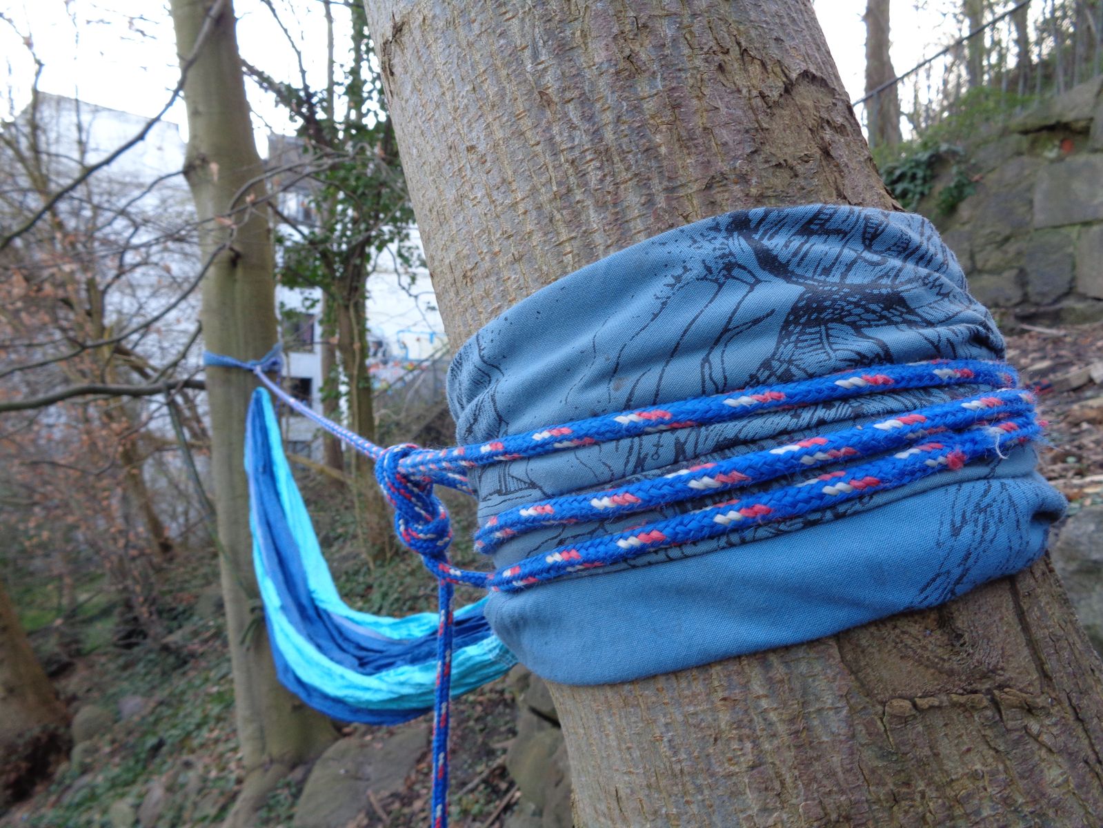 Für's reisen habe Ich tatsächlich ein relativ dünnes Seil (etwa 1,5cm), Das würde Ich aber niemals blank um einen Baum legen, sondern lege ein eingerolltes Stofftuch (80cm/80cm) zwischen Baum und seil. Davon haben Wandergesellen immer einige dabei, denn unsern ganzes Gepäck wird in diesen ,,Scharlottenburgern" eingepackt.