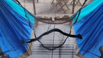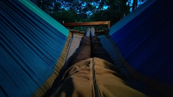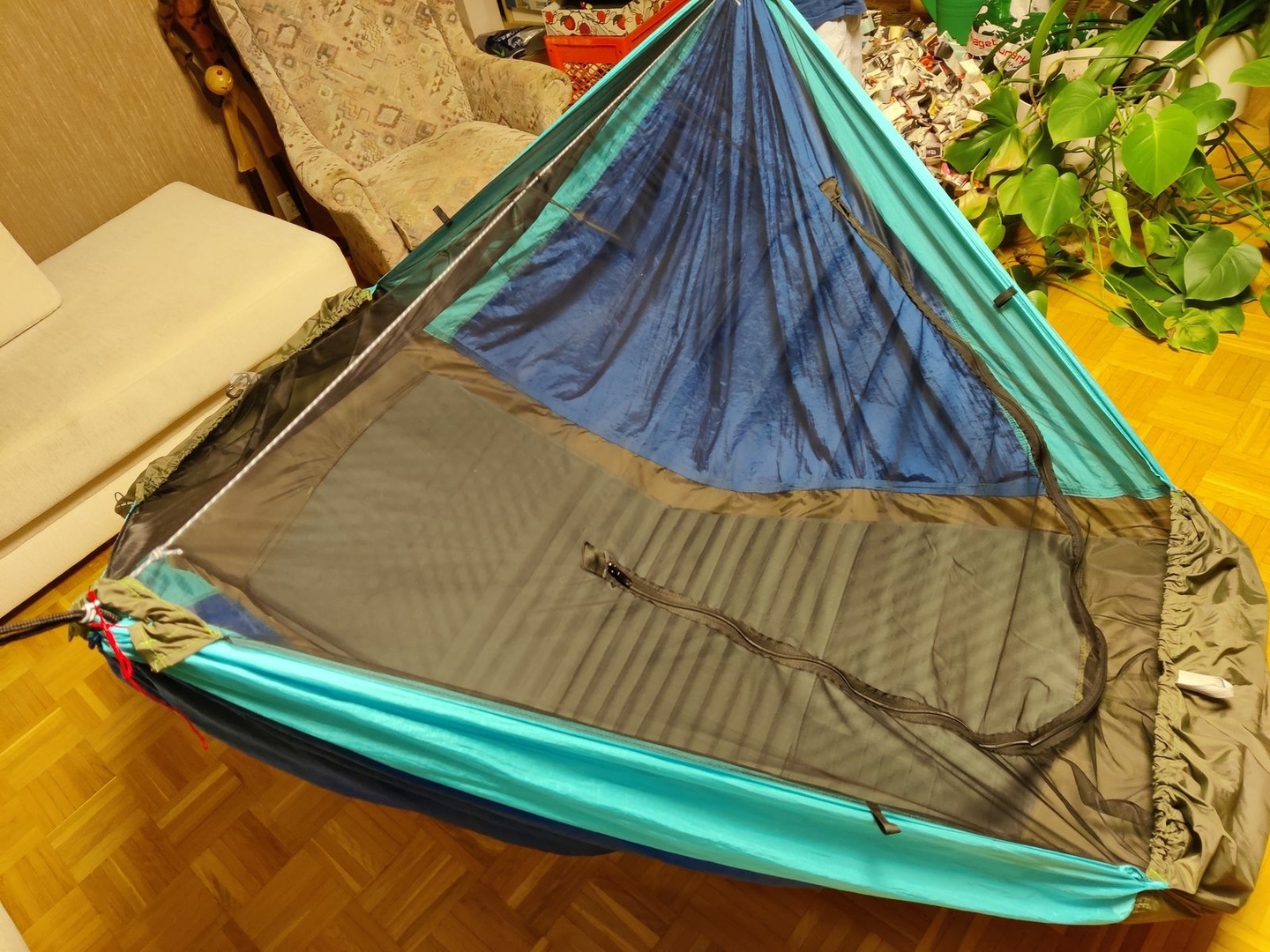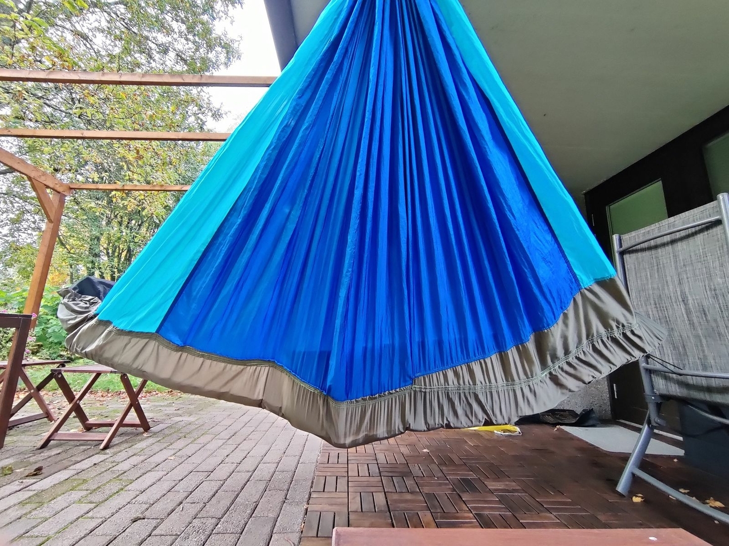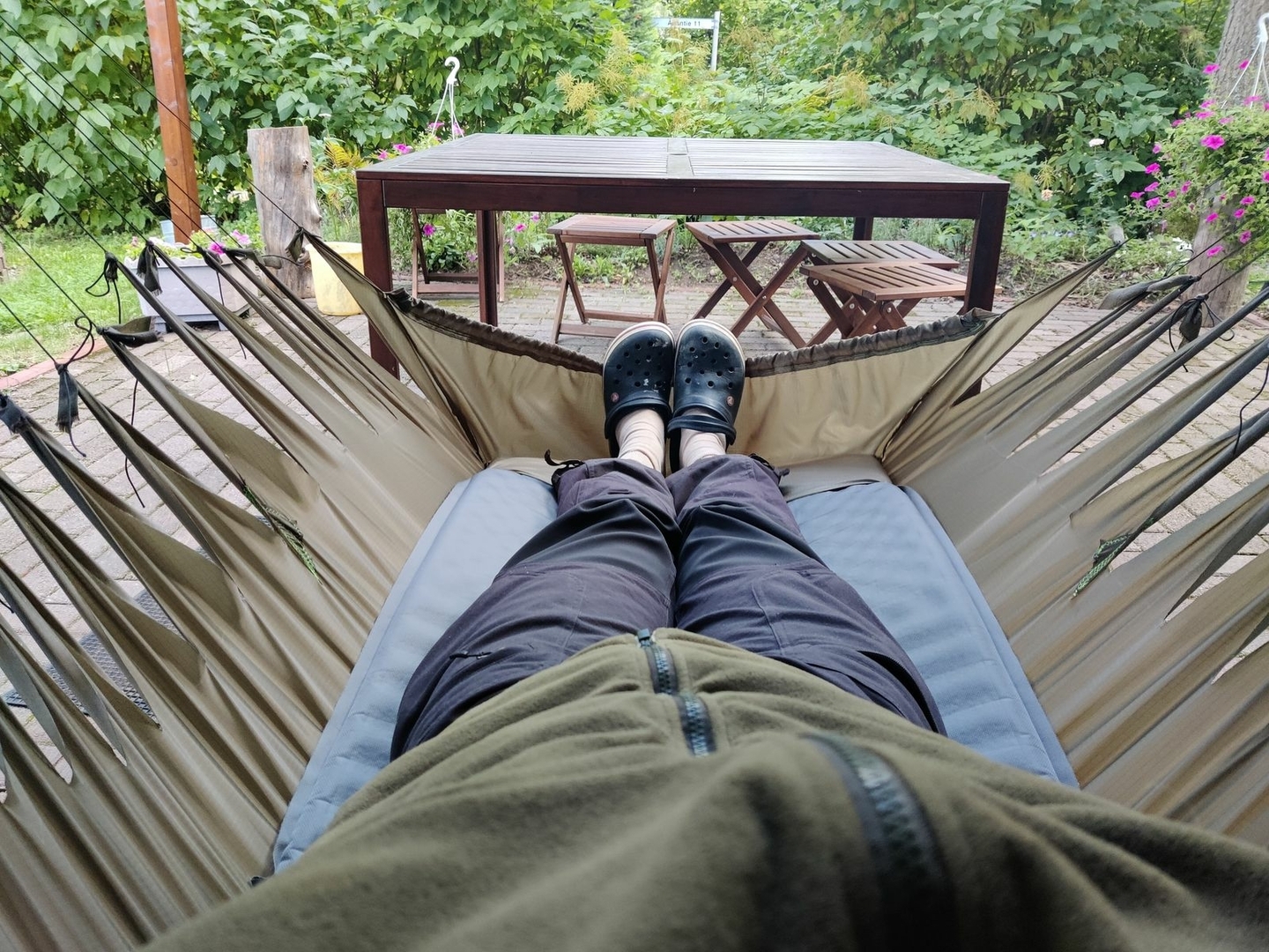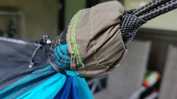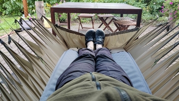 … und schon sieht keiner mehr die schiefen, sorry, die außergewöhnlichen Nähte der Hängematte mehr.