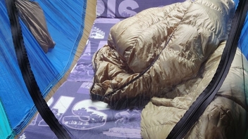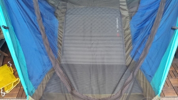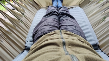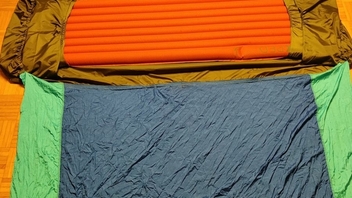 Beim Schlafen in der Nacht (und Nachprüfen am Morgen) hab ich dann noch erfahren dürfen, dass man die Isomatte mit der "warmen Seite" nach oben legen sollte. Offenbar ist die Kunstfaserisolation nur auf der oberen Seite innen angeklebt, anders herum fällt sie dann in sich zusammen(?).