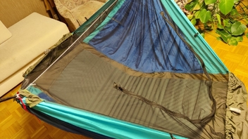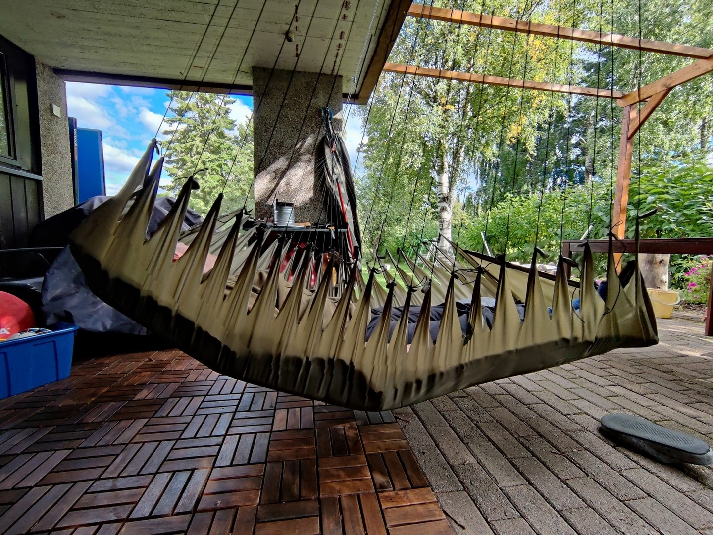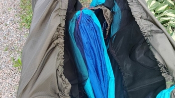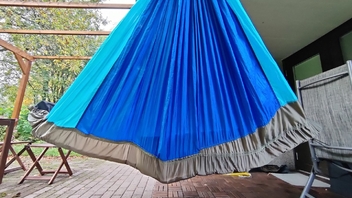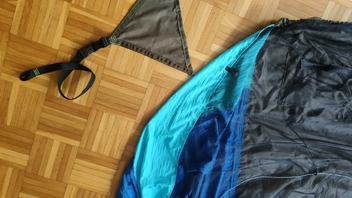 Die größte Herausforderung war, die Stoffdreiecke zur Tieferlegung so einzunähen, dass keine lokalen Spannungsüberhöhungen entstehen, v.a. im Übergangsbereich an den Dreiecksspitzen, da man dort die Säume irgendwie "auslaufen" lassen muss, und alles ja unter meiner Last halten muss. Scheint mir aber ganz gut gelungen zu sein.