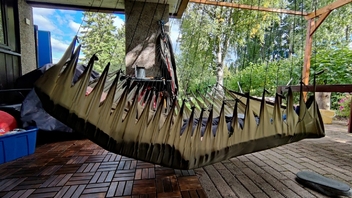 Vermutlich werde ich nun entweder im Knie-bis Pobereich den Stoff doppeln oder die kurzen Kanten dort alle durch Band verstärken oder (mal überlegen) die Zähne/Seile sogar durch ununterbrochenen Stoff ersetzen. (?)