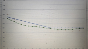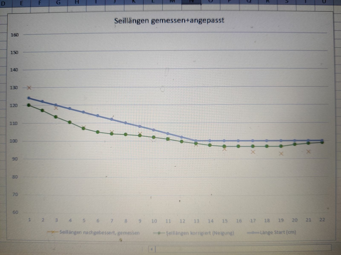 Aber erst mal habe ich den dritten Zahn operiert, alle Seile (nach gefühlt guter Einstellung) gemessen, in Excel gemittelt und die Form abgerundet (siehe Grafik), die Neigung noch angepasst ( Füsse etwas höher) und die Schnüre dann auf dem Teppichboden cm-genau korrigiert.