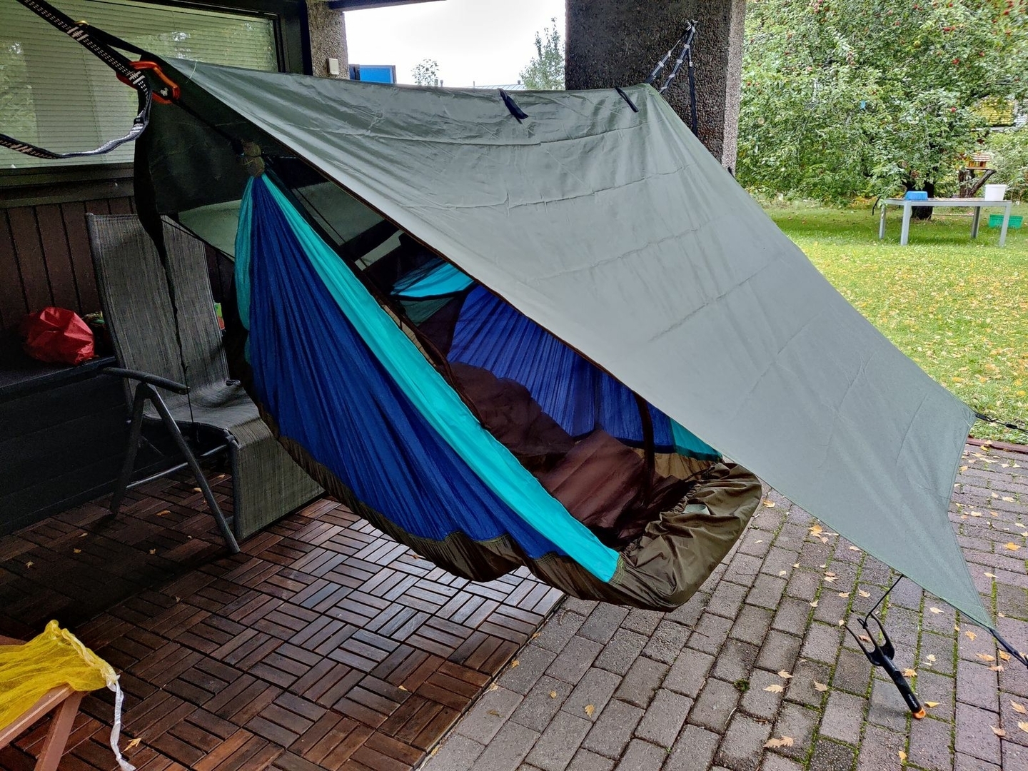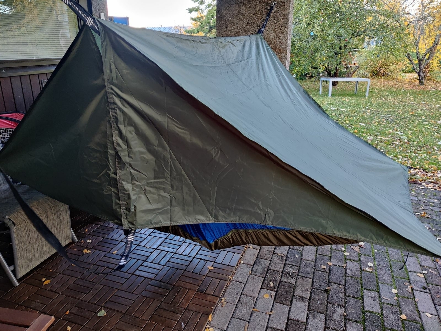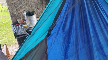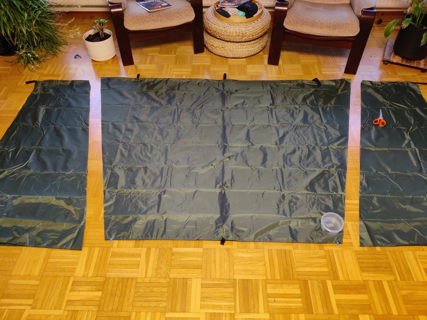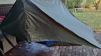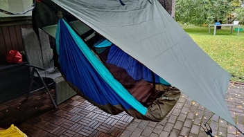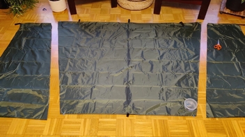 Schnell noch im finnischen Hobby-Paradies ein 3mx3m-Günstig-Tarp gekauft und zum 2mx3m-Quer-HM-Tarp umgenäht: